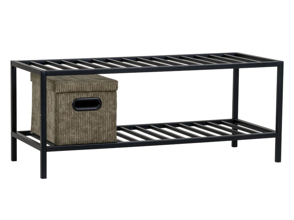 Stylový kovový botník v černé barvě s 2 policemi a rozměry 79×34 cm Vita nabízí praktické a odolné řešení pro ukládání bot. Moderní a minimalistický design se hodí do předsíně, šatny nebo haly, kde pomůže udržet pořádek a přidá industriální nádech vašemu prostoru. Ideální pro efektivní skladování a snadnou údržbu.