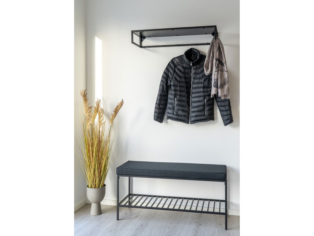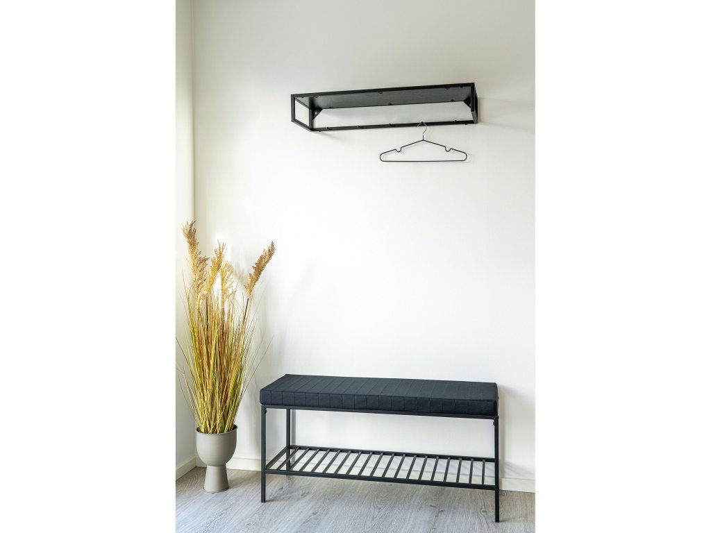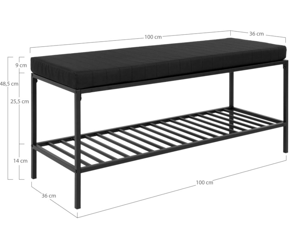 Stylová černá kovová lavice s polštářem a policí o rozměrech 100×36×48,5 cm Vita Bench nabízí praktické a elegantní způsoby, jak zpříjemnit váš interiér nebo předsíň. Polštář zajišťuje pohodlné sezení, zatímco spodní police poskytuje prostor pro boty nebo doplňky. Ideální pro vstupní halu, předsíň nebo odpočinkovou zónu, kde kombinuje styl s funkcí.