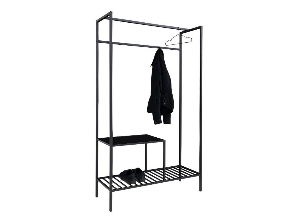 Moderní kovová předsíňová sestava v černé barvě o rozměrech 101×38×170 cm Vita nabízí praktické a stylové řešení pro vaši vstupní halu nebo předsíň. Zahrnuje prostor pro odložení oblečení, kabelky nebo klíčů, a díky odolnému kovovému designu je snadno udržovatelná. Elegantní industriální vzhled a funkčnost pomohou udržet pořádek a doplní váš interiér moderním stylem.