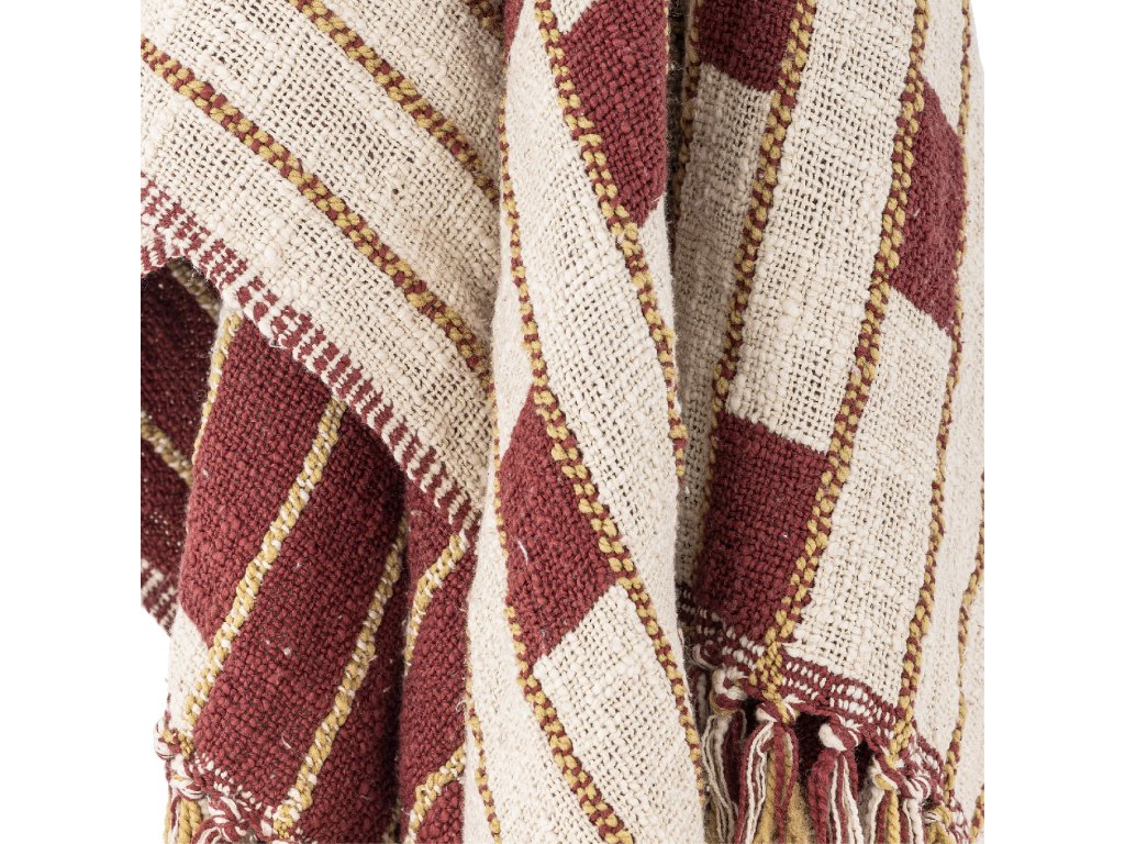 Přehoz Cang od Bloomingville je tkaný z bavlny se širokými pruhy v teplých červených a béžových odstínech. Dekorativní třásně po okrajích dodávají uvolněný a útulný vzhled. Ideální pro vytvoření tepla a pohodlí v obývacím pokoji nebo na terase.Doplňkové parametry