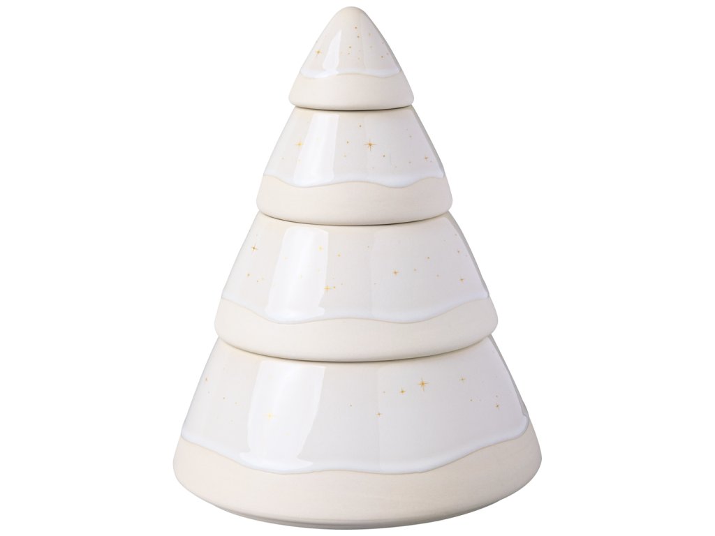 Originální dóza ve tvaru vánočního stromečku z kolekce Winter Glow přináší spojení efektní glazury a jemných motivů, které připomínají zasněžený povrch. Perfektní pro uložení cukroví nebo jako dekorativní prvek.