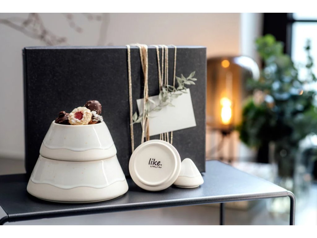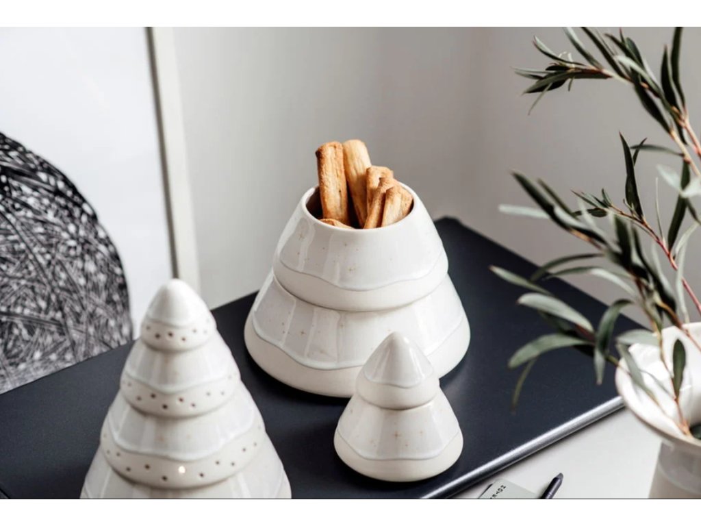 Originální dóza ve tvaru vánočního stromečku z kolekce Winter Glow přináší spojení efektní glazury a jemných motivů, které připomínají zasněžený povrch. Perfektní pro uložení cukroví nebo jako dekorativní prvek.