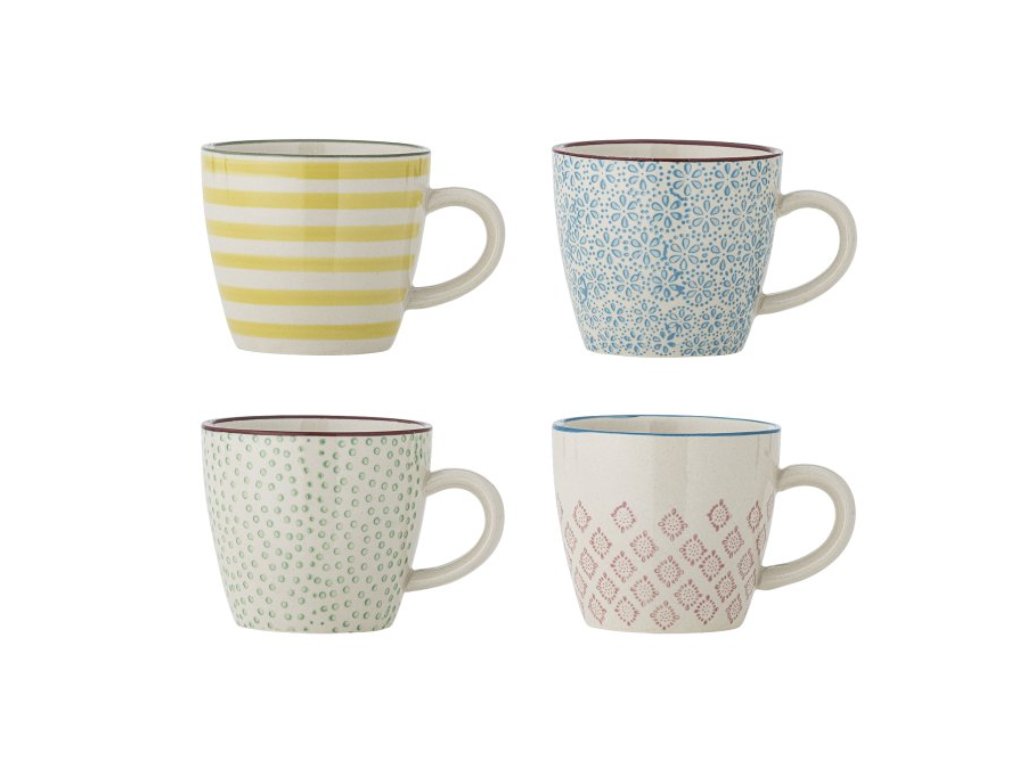 Sada čtyř kameninových hrnků Patrizia Cup od Bloomingville v jemných béžových tónech s veselými potisky v červené, zelené, žluté a modré barvě. Každý hrnek se vyznačuje jemnými ručně malovanými detaily, které stolu dodávají hravý a harmonický vzhled. Krásná sada pro každodenní chvíle i pro uvolněná setkání.Doplňkové parametry