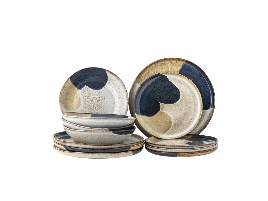 Sada nádobí Jules od Bloomingville je vyrobena z kameniny s reaktivní glazurou v tmavě modrých, zlatých a světle hnědých odstínech. Živá hra barev vytváří umělecký výraz, díky kterému je každý talíř jedinečný. Sada obsahuje 4 x 3 kusy: jídelní talíře, obědové talíře a hluboké talíře – ideální pro atmosférické prostírání.Doplňkové parametry