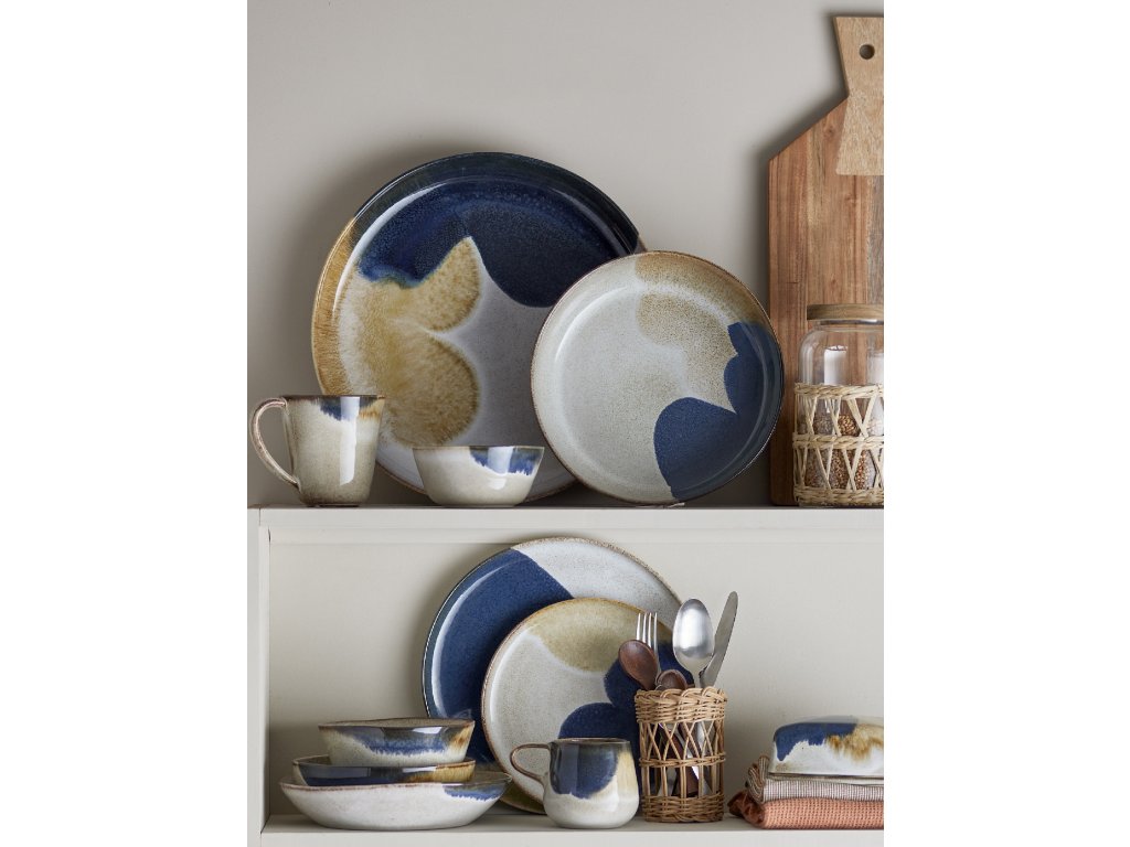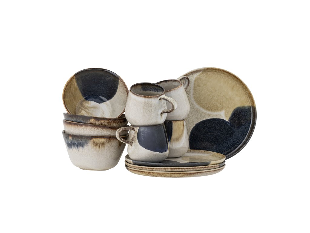Snídaňová sada Jules od Bloomingville je vyrobena z kameniny s krásnou reaktivní glazurou v tmavě modrých, zlatých a světle hnědých odstínech. Barvy se elegantně prolínají a vytvářejí zářivý, téměř umělecký vzhled – každý kus je tak skutečně jedinečný. Sada se skládá ze 4 x 3 kusů: šálků, misek a talířů.Doplňkové parametry