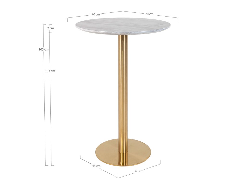 Barový stůl Borzano je elegantní a moderní kus nábytku, který skvěle kombinuje luxusní vzhled s funkčností. Deska o designe s mramorovým motivem přináší do interiéru sofistikovaný a nadčasový vzhled, zatímco mosazná podnož dodává stolku jemnou industriální a glamourovu nádech. S rozměry ø70 cm a výškou 105 cm je tento barový stůl ideální do domácích barů, restaurací nebo moderních jídelních koutů, kde poslouží jak k příjemnému posezení, tak i k servírování nápojů nebo drobného občerstvení. Díky svému stylovému vzhledu je vhodný do interiérů v industriálním, moderním nebo glamour stylu, kde vytváří výrazný a atraktivní prvek.