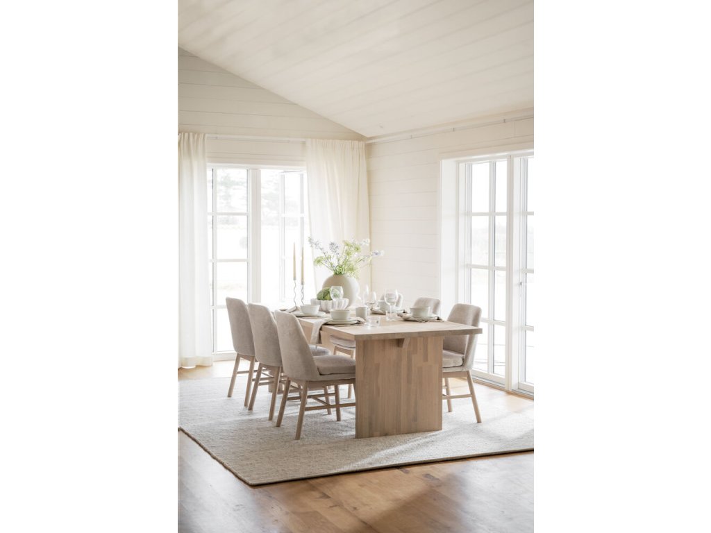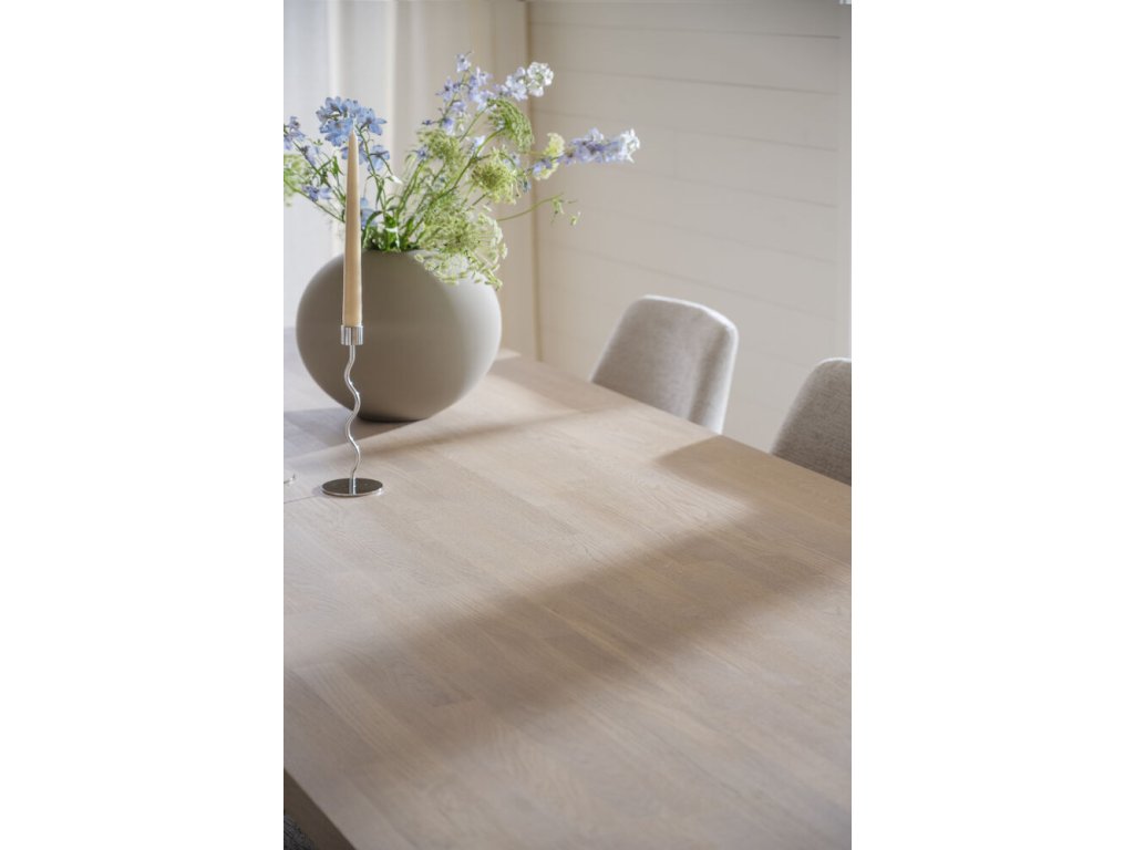 Exkluzivní jídelní stůl Emmett z bíle natřeného dubu je vyroben ze 100% evropského dřeva s certifikací FSC. Masivní deska stolu s kartáčovaným povrchem spočívá na dvou stabilních masivních nohách. Jídelní stůl Emmett je nadčasový jídelní stůl, který vydrží rok co rok. Skutečnost, že stůl je vyroben ze 100% dřeva s certifikací FSC, znamená, že veškeré dřevo pochází ze zodpovědného lesnictví, kterému záleží na lidech a životním prostředí. Přesah horní desky na kratší straně: 27,5 cm. K dispozici v několika barvách. POVRCHOVÁ ÚPRAVA: Jídelní stůl byl ošetřen přípravkem Rubio Monocoat, který poskytuje odolný povrch, jenž účinně odolává opotřebení. To znamená, že stůl před použitím nevyžaduje další ošetření. Pro zachování krásy stolu doporučujeme pravidelnou údržbu přípravkem RUBIO Surface Care pro účinné čištění skvrn (v případě potřeby) a také přípravkem RUBIO Refresh Eco pro osvěžení povrchu dřeva (v případě potřeby, až 4krát ročně). Další informace naleznete v pokynech k péči.