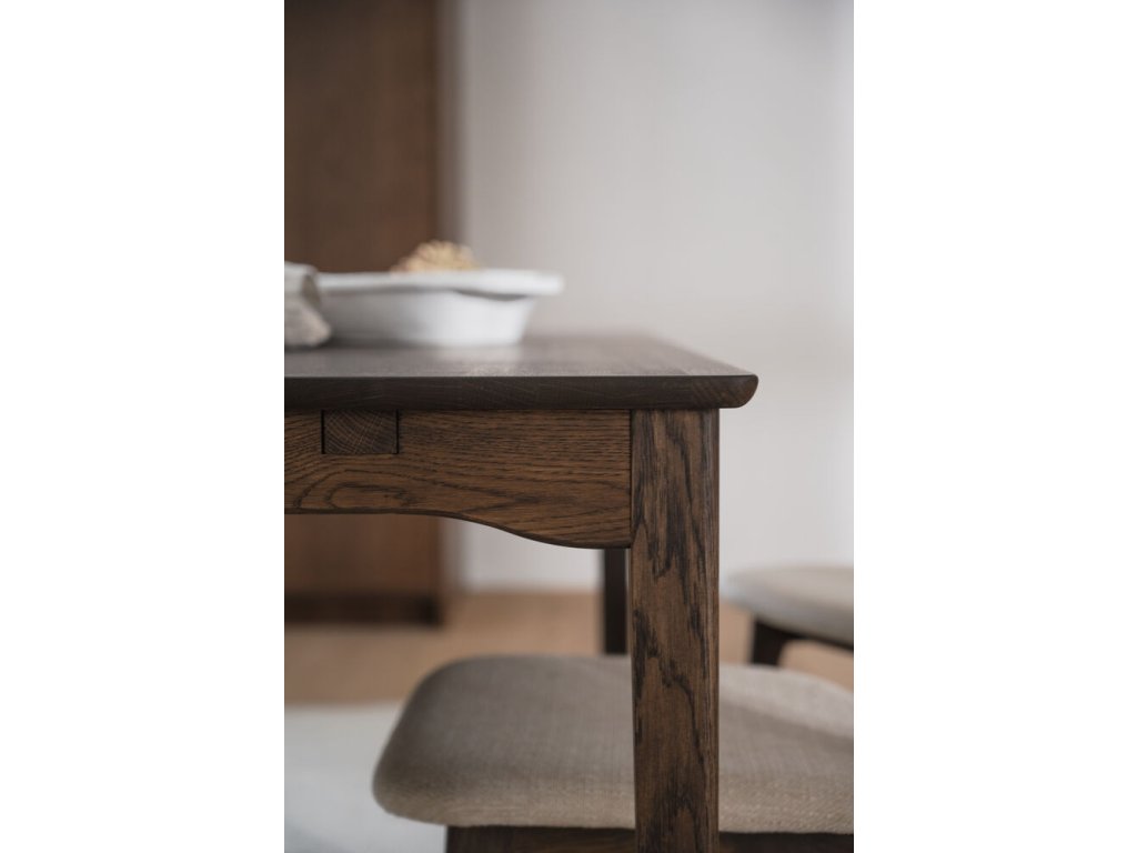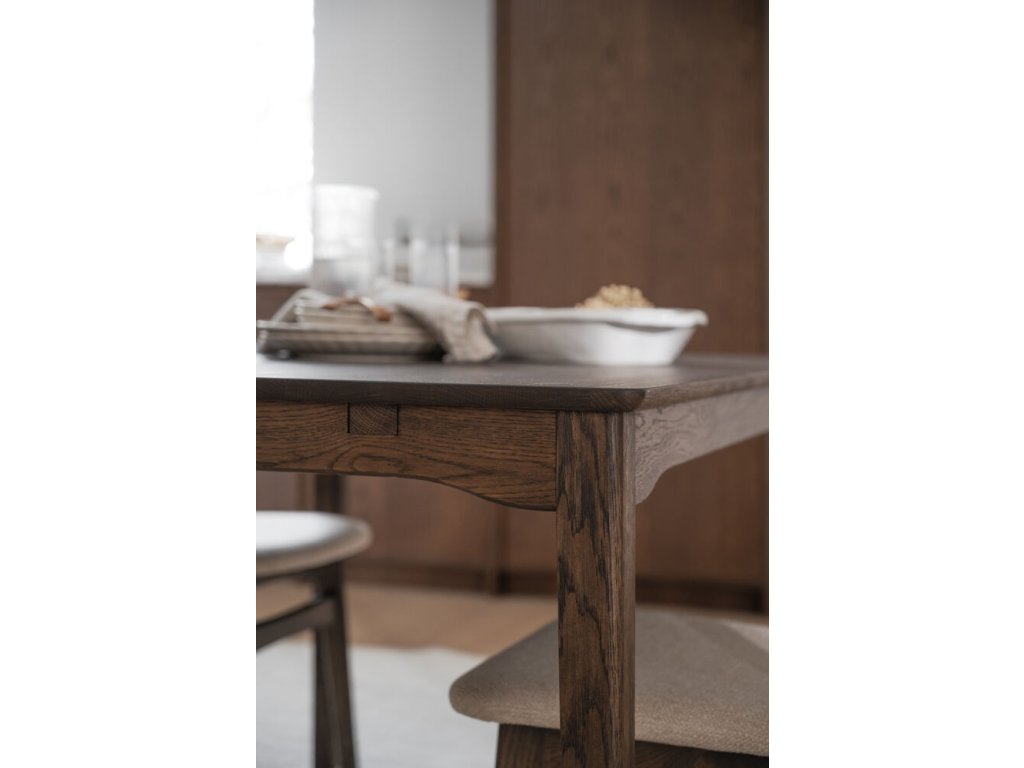 Markham je úhledný obdélníkový jídelní stůl. Stůl je vyroben z masivního hnědého olejovaného dubu s elegantními detaily, jako je zaoblený profil pod deskou stolu a zaoblené nohy. Díky tomuto designu je jídelní stůl velmi oblíbený a odolný napříč generacemi. Jídelní stůl je přizpůsobivý a lze jej pomocí jedné nebo dvou přístavných desek rozložit na 225 nebo 270 cm, což jej činí flexibilním v závislosti na počtu hostů. Markham také zahrnuje menší jídelní stůl a příborník. Kolekce je vyrobena ze 100% dřeva s certifikací FSC®, což z ní činí udržitelnou volbu. POVRCHOVÁ ÚPRAVA: Jídelní stůl byl ošetřen přípravkem Rubio Monocoat, který poskytuje odolný povrch, jenž účinně odolává opotřebení. To znamená, že stůl před použitím nevyžaduje další ošetření. Pro zachování krásy stolu doporučujeme pravidelnou údržbu přípravkem RUBIO Surface Care pro účinné čištění skvrn (v případě potřeby) a také přípravkem RUBIO Refresh Eco pro osvěžení povrchu dřeva (v případě potřeby, až 4krát ročně). Další informace naleznete v pokynech k údržbě.