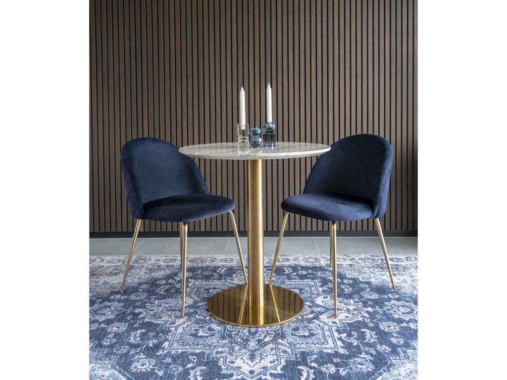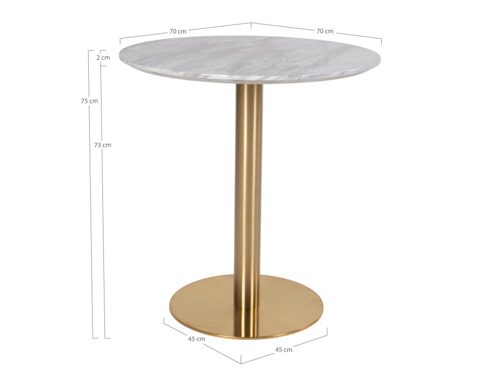 Jídelní stůl Bolzano vyniká moderním a luxusním vzhledem. Kulatá deska o průměru 70 cm je vyrobena z kvalitní MDF desky v dekoru bílého mramoru, který působí elegantně a nadčasově. Dominantním prvkem je jedna centrální kovová noha ve zlaté barvě, která dodává stolu stabilitu a výrazný designový akcent.