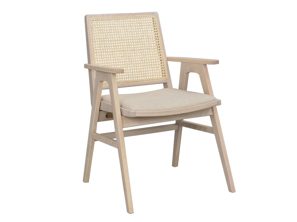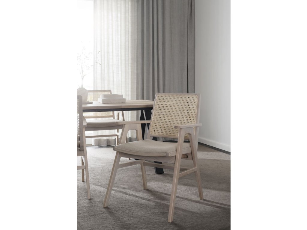 Sedák je čalouněn odolnou béžovou látkou, která nabízí vysoké pohodlí, a propracovaná područka dodávají židli eleganci i komfort. Tento model je dostupný také ve variantě s hnědým lakovaným dubem a tlumeným nádechem přírody.