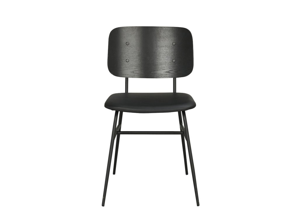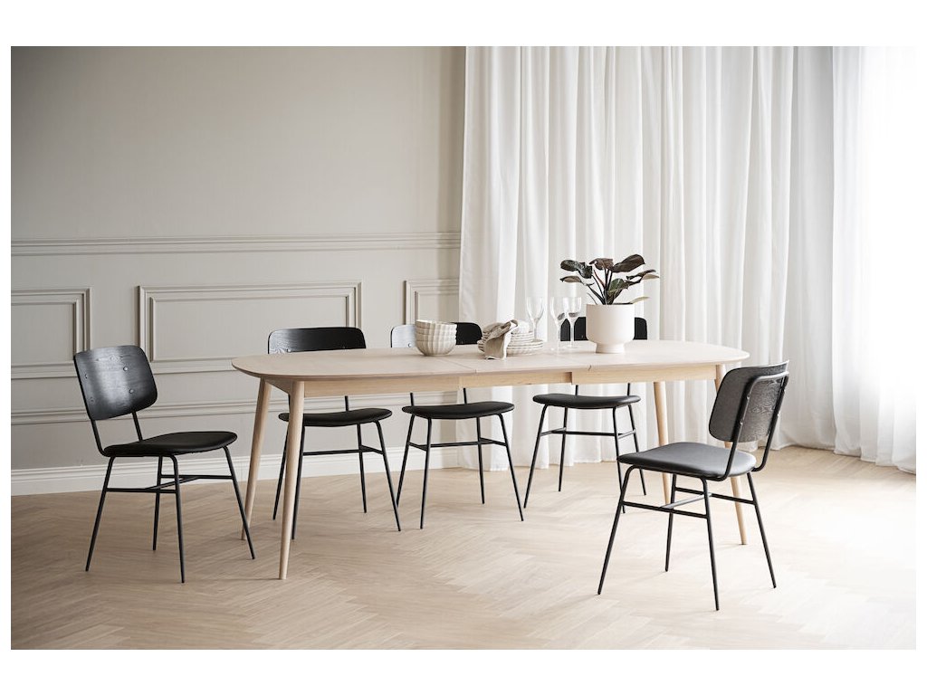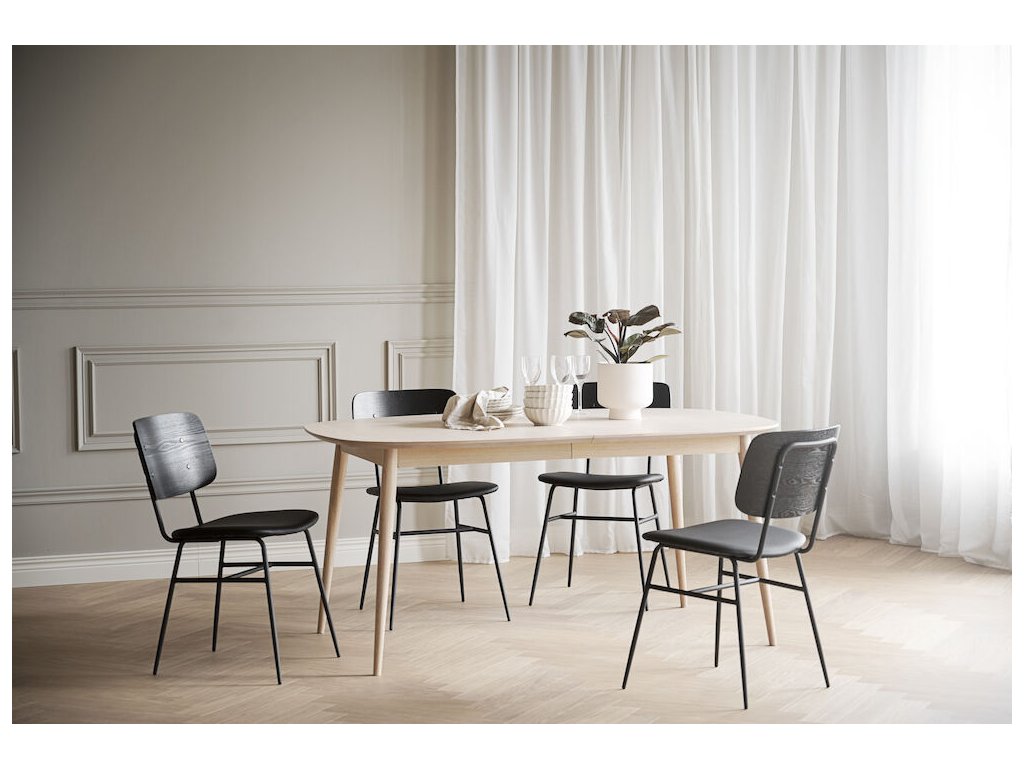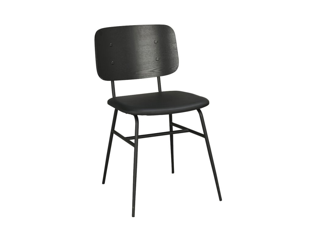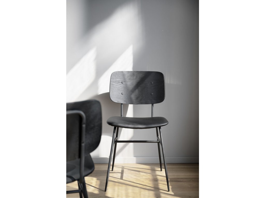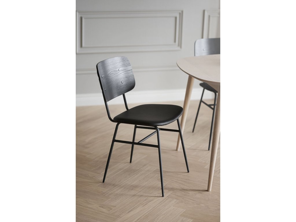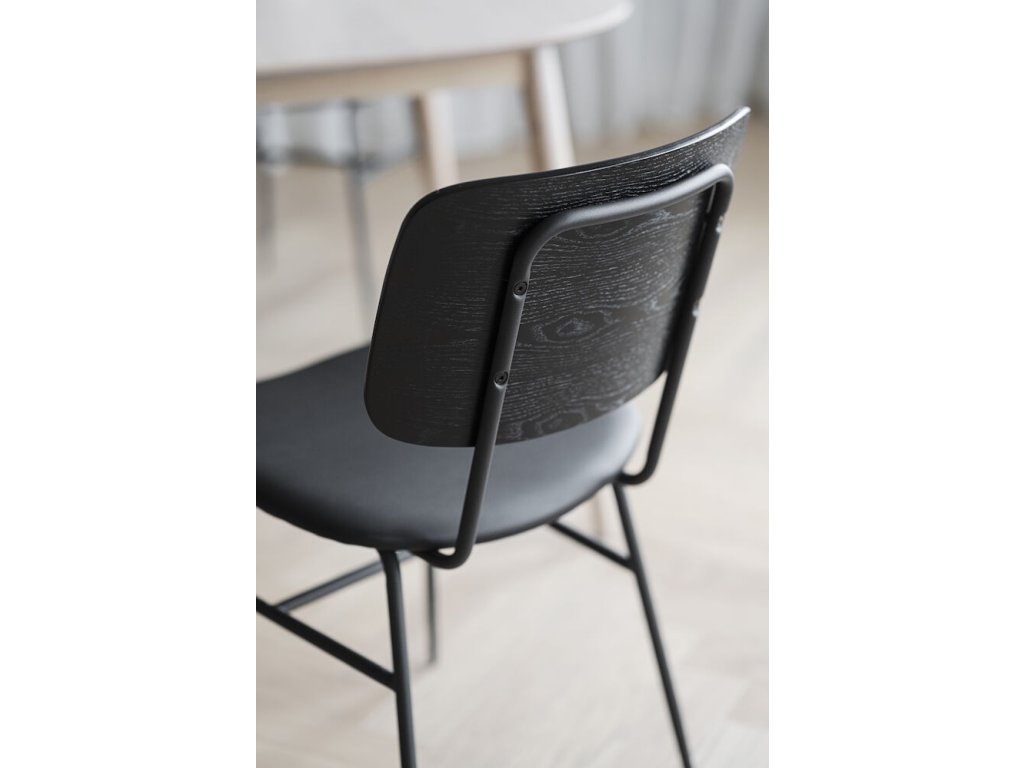 Sedák je z překližky polstrovaný umělou kůží, což zajišťuje vysoké pohodlí i odolnost při každodenním používání. Opěradlo je z jasanového dřeva, které kontrastuje s černým rámem a vytváří moderní a nadčasový design.
