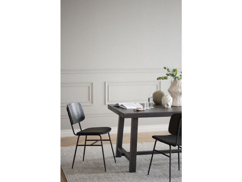 Židle Brent je moderní a stylová černá jídelní židle s odolnou povrchovou úpravou. Rám je z práškově lakovaného kovu s pískovou strukturou, který má kulatý profil a zužující se nohy, což přispívá k její stabilitě a elegantnímu vzhledu. Zadní panel je vyroben z překližky s jasanovou dýhou, dodávající židli přírodní a luxusní akcent.