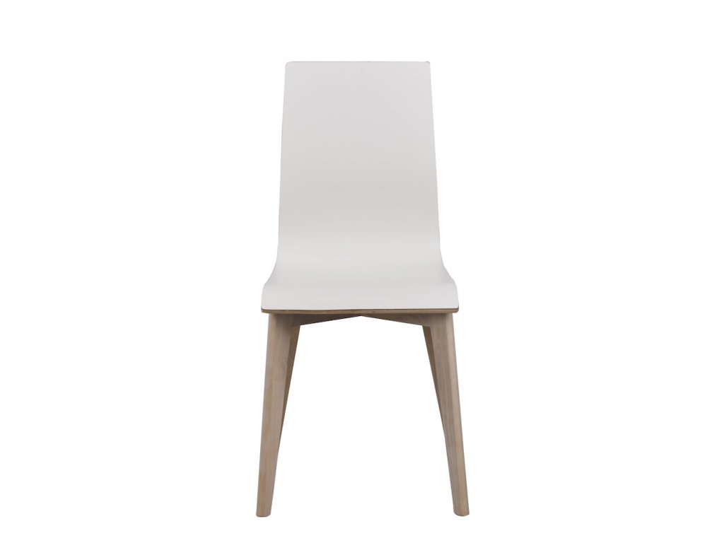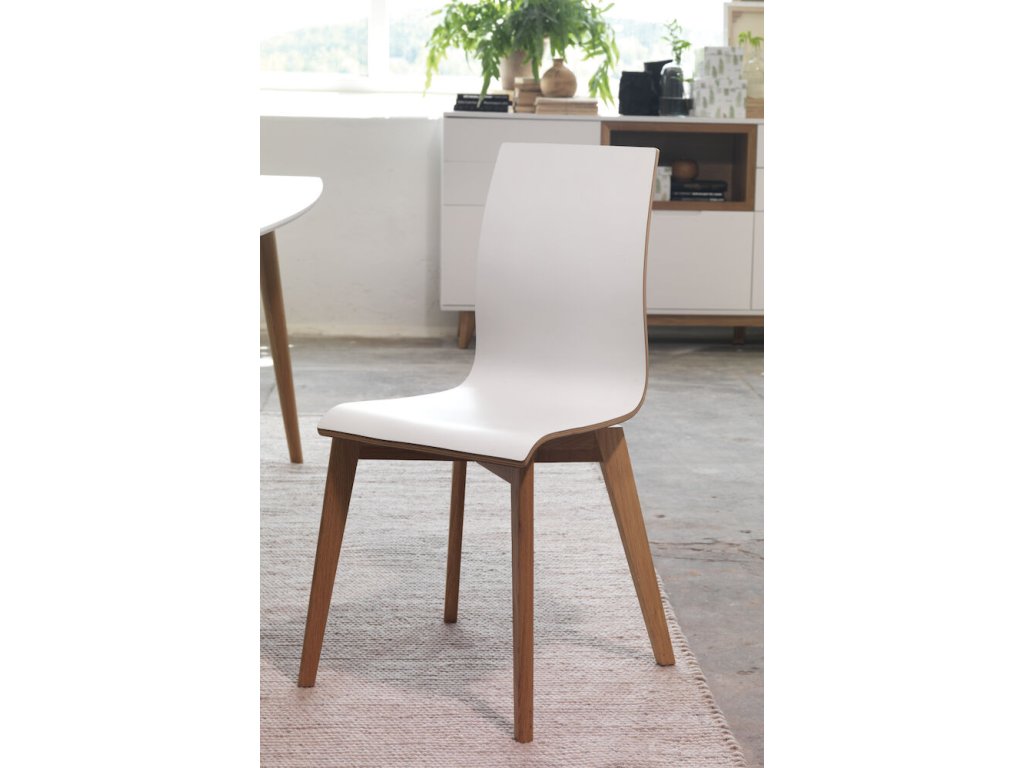 Další dostupná varianta je s bílým laminátem na sedáku a nohy z lakovaného dubu, opět jsou zde kombinovány styl a komfort. Tento model je ideální pro různě zařízené jídelny a snadno ladí s různými styly stolů.
