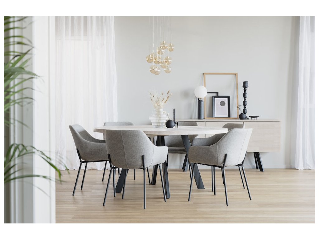 Židle Haley je moderní a prostorné jídelní židle s vysokým komfortem sezení. Sedák je čalouněn polypropylenovou tkaninou ve světle šedé barvě, která v některých odstínech může mírně naklánět k béžové, čímž dodává židli autentický a nadčasový vzhled.