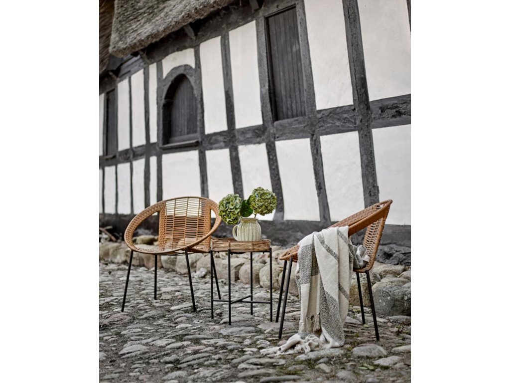Sada Dudine Lounge od Bloomingville je třídílná sada na terasu nebo do zahrady. Obsahuje dvě stohovatelná křesla a kulatý stůl s vyvýšeným okrajem. Je vyrobena ze světle hnědého polyratanu a černého kovu, takže má lehký a elegantní vzhled. Venkovní nábytek doporučujeme umístit do krytých prostor.