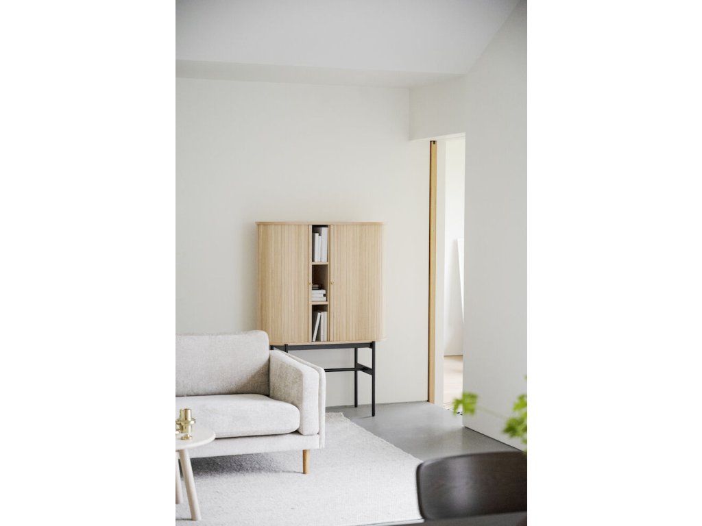 Skříňka Haddington se svým oválným tvarem, posuvnými lamelovými dvířky a mosazně zbarvenými úchytkami představuje stylový a moderní úložný prvek pro každý interiér. Elegantní design doplňují vysoké nohy z černého kovu s práškovým lakováním v pískové struktuře, které nábytku dodávají lehkost a vzdušnost.