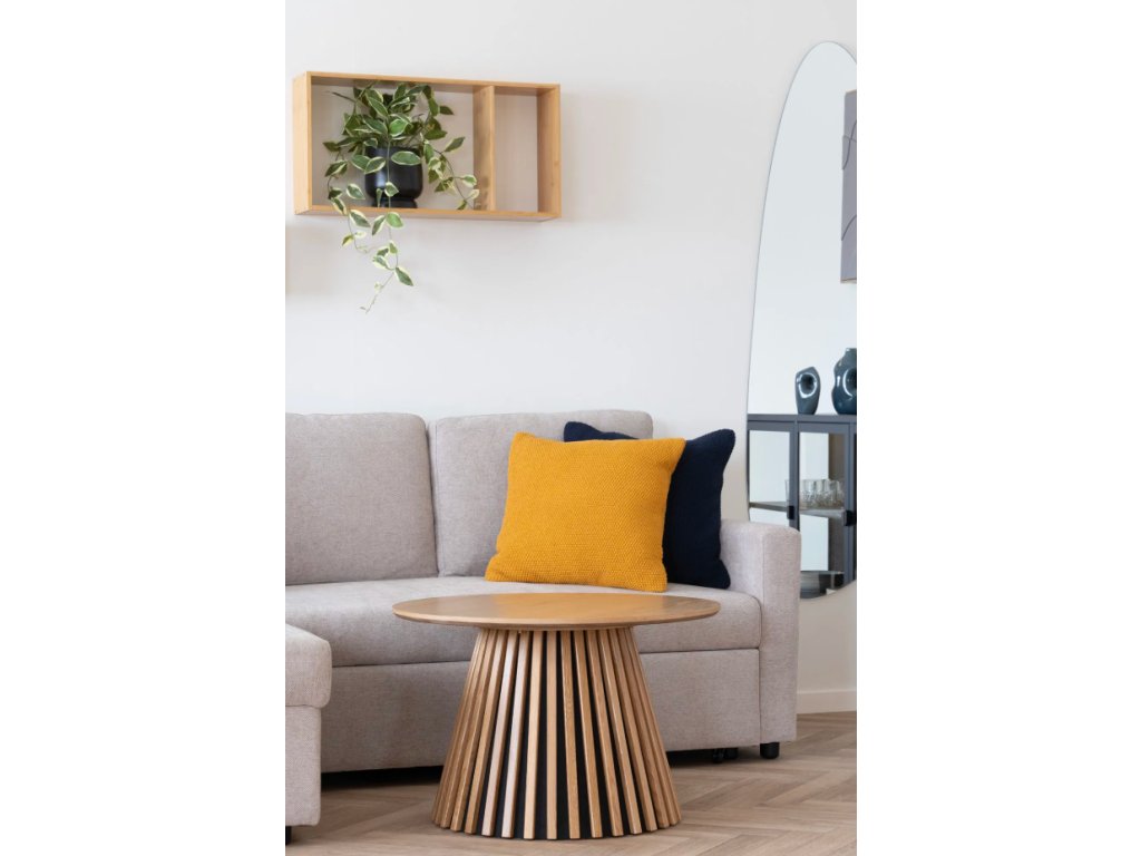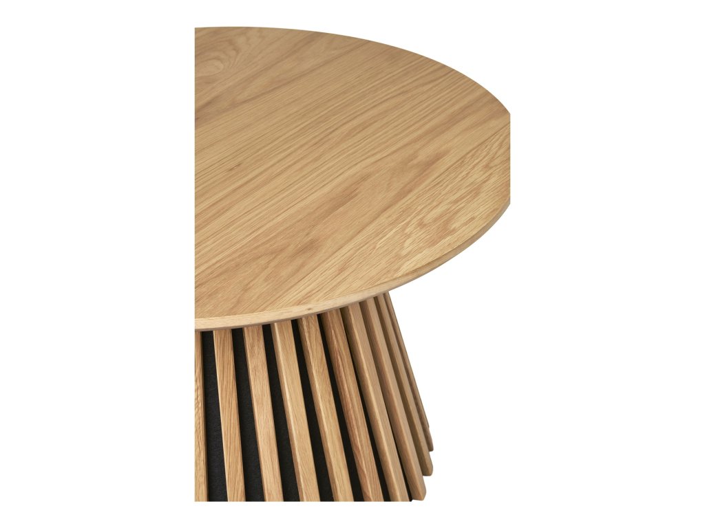 Elegantní kulatý konferenční stolek s deskou z dubové dýhy v přírodním provedení. Průměr 70 cm a výška 45 cm činí tento kousek ideální pro moderní i rustikální interiéry. Přírodní dřevo přináší do prostoru teplo a útulnost, zatímco precizní zpracování zaručuje dlouhou životnost a stylový vzhled.