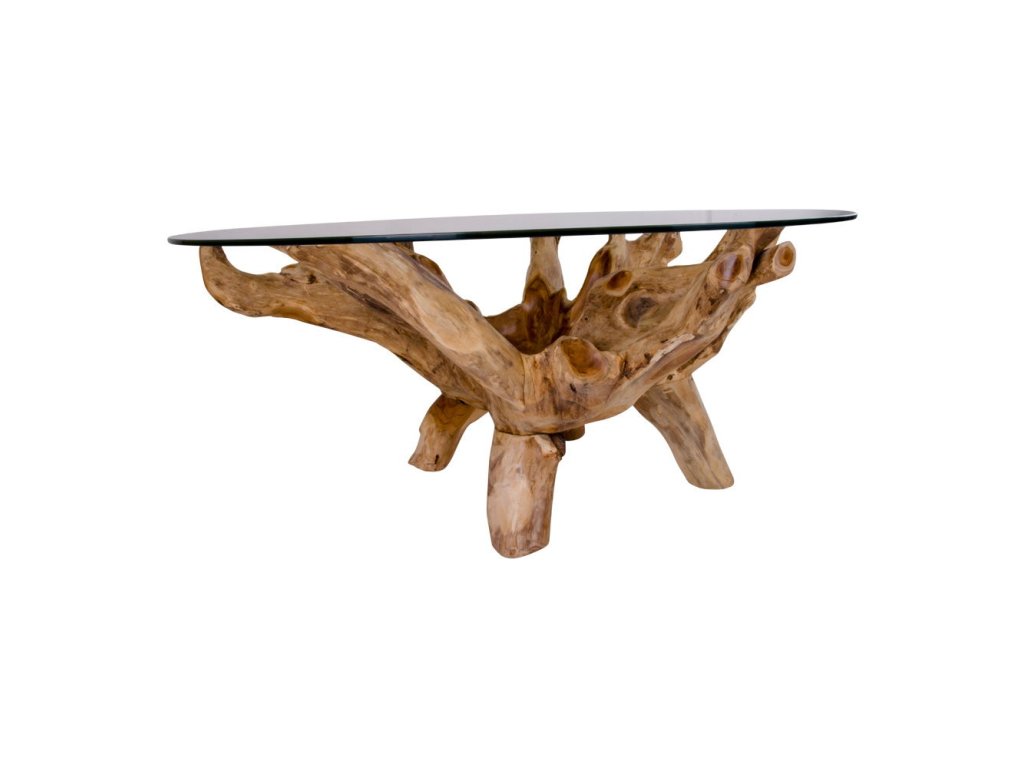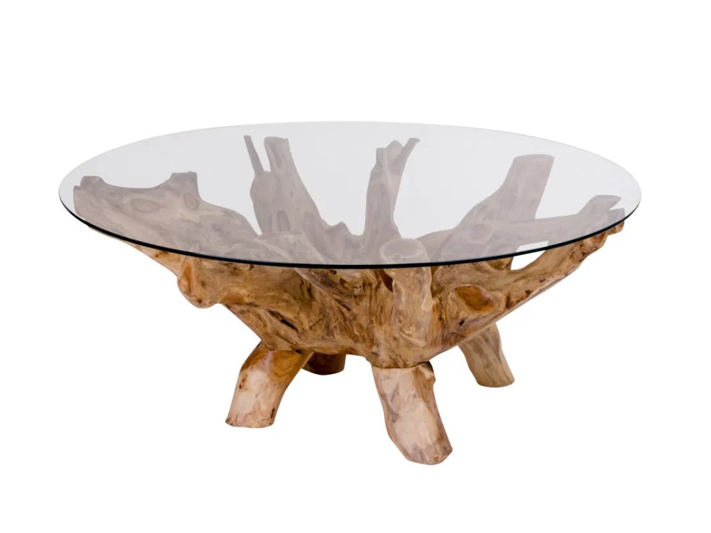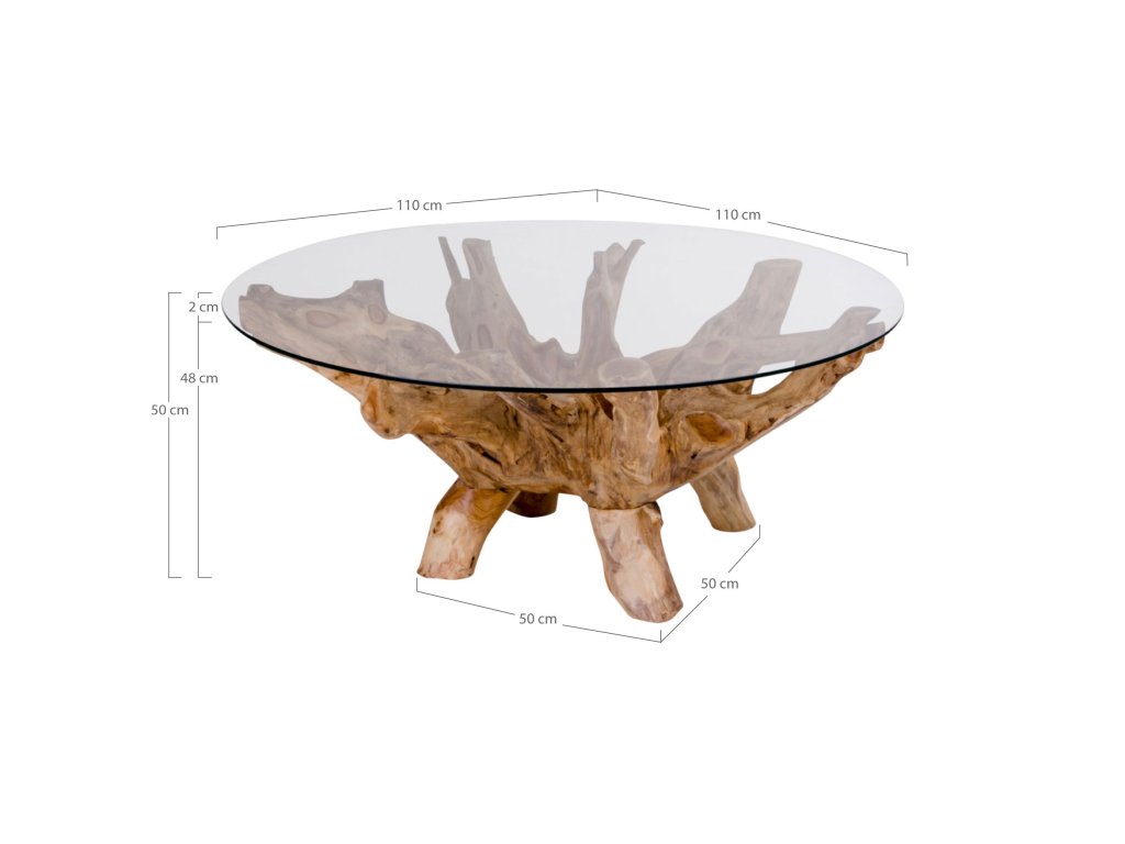 Elegantní kulatý konferenční stolek s polevou z čirého skla a dřevěným podstavcem, délka 110 cm. Stylový doplněk do moderního obývacího pokoje, který kombinuje průhlednost a přírodní vzhled. Ideální pro odkládání dekorací, knih nebo nápojů.