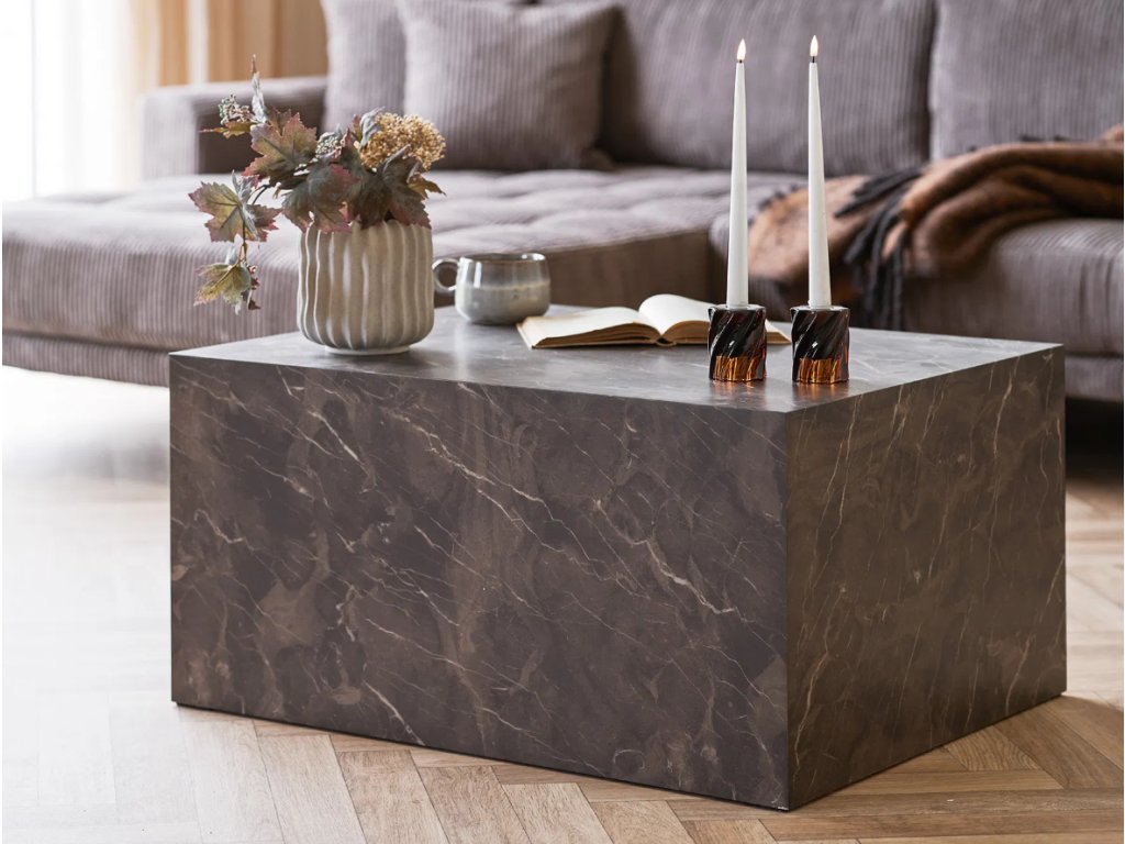 Stylový konferenční stolek Prague s deskou z hnědého mramoru přináší do obývacího pokoje jedinečný expresivní prvek. Hnědý mramor s přirozenými žilkami působí luxusně a teple, zatímco rozměr 60 × 80 cm nabízí ideální plochu pro dekorace, knihy nebo odložení nápojů a doplňků.