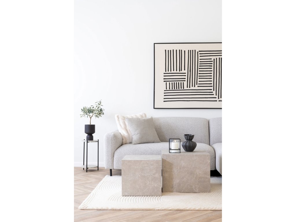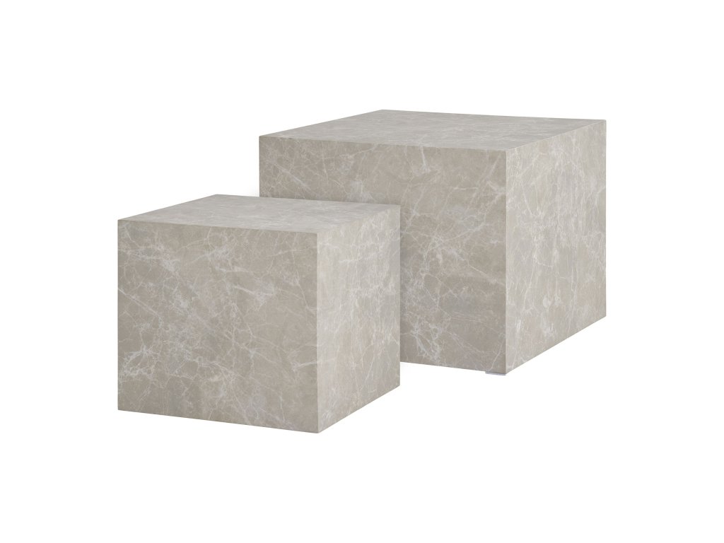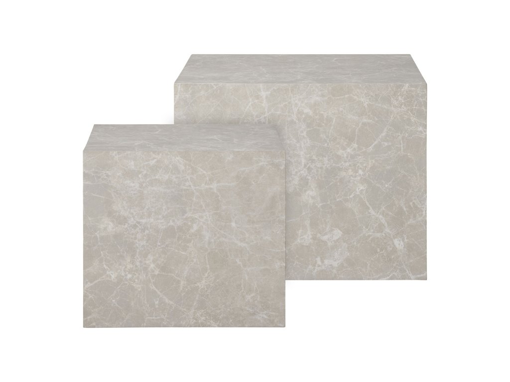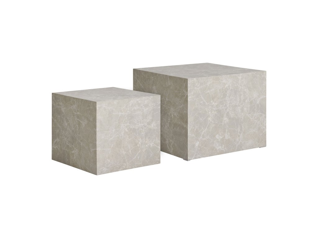 Lehká konstrukce stolů zajišťuje snadnou manipulaci a přesun podle aktuální potřeby. Mramorový vzhled desek nabízí vizuální hloubku a luxusní detail, který pozvedne atmosféru celého pokoje.