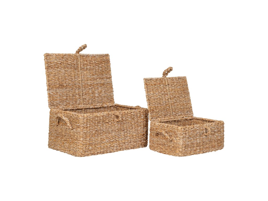 Elegantní sada dvou dekorativních košíků s víkem z přírodní mořské trávy. Díky pevnému a ručně pletenému provedení jsou košíky nejen praktickým úložným řešením, ale i stylovým doplňkem interiéru. Vhodné na uskladnění drobností, textilu nebo jako dekorace do obývacího pokoje, ložnice či chodby.