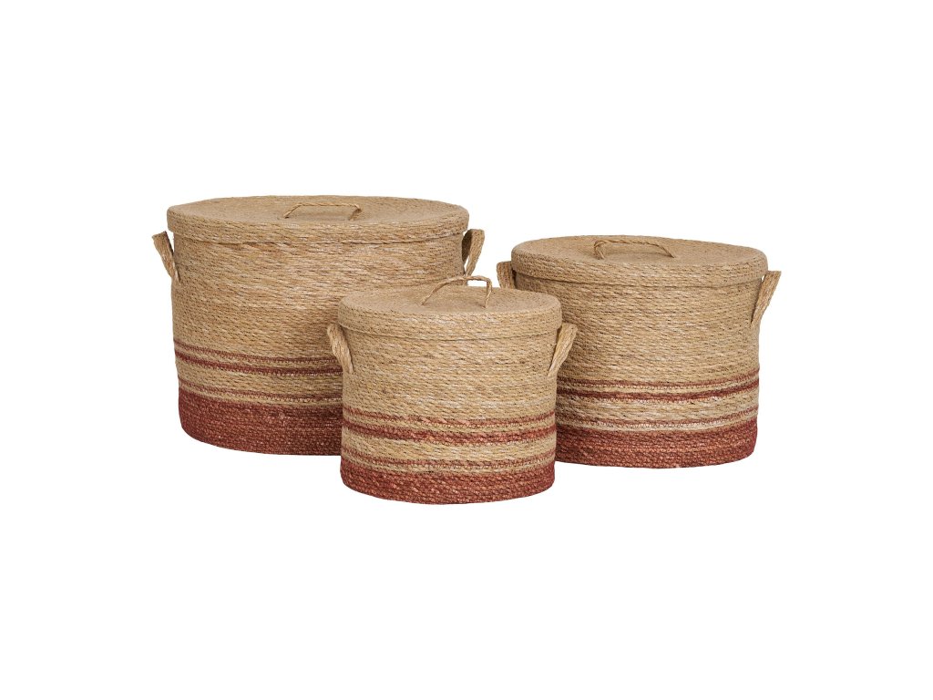 Elegantní a praktická sada tří košíků z mořské trávy v kombinaci přírodní a hnědé barvy. Každý košík je vybaven víkem, které chrání obsah před prachem a udržuje věci přehledně uschované. Díky přírodnímu materiálu mají košíky lehký, vzdušný vzhled a skvěle se hodí do moderních, boho i rustikálních interiérů.