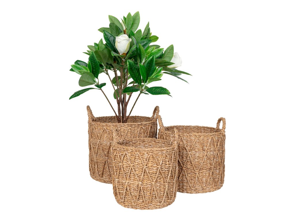 Praktická a dekorativní sada tří kulatých košů z mořské trávy v přírodní barvě. Díky ručně pletenému designu působí elegantně a útulně, hodí se do moderních i přírodně laděných interiérů. Koše lze využít nejen jako originální obaly na květináče, ale také jako praktické úložné košíky pro textilie, hračky či drobnosti. Díky univerzálnímu vzhledu se snadno kombinují s moderním i tradičním zařízením.
