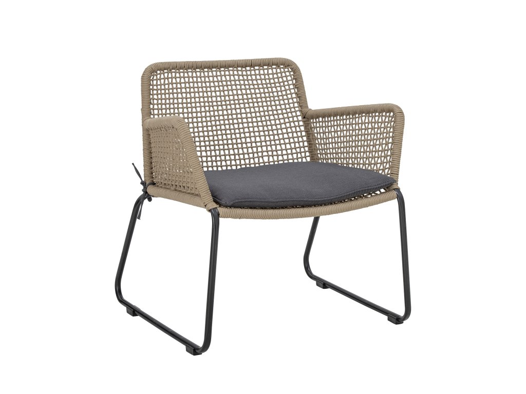 Křeslo Mundo Lounge od Bloomingville je vyrobeno z práškově lakovaného černého kovu se světle hnědým polyesterovým lanem ručně vetkaným do rámu. Tmavě šedý potah polštáře je vyroben z polyesteru. Zahradní židle je vhodná do všech venkovních prostor, ale ochranou pohovky před přímým slunečním zářením se prodlouží barva látky a trvanlivost pohovky. Dokonalá zahradní židle pro pohodlí a relaxaci venku.Doplňkové parametry