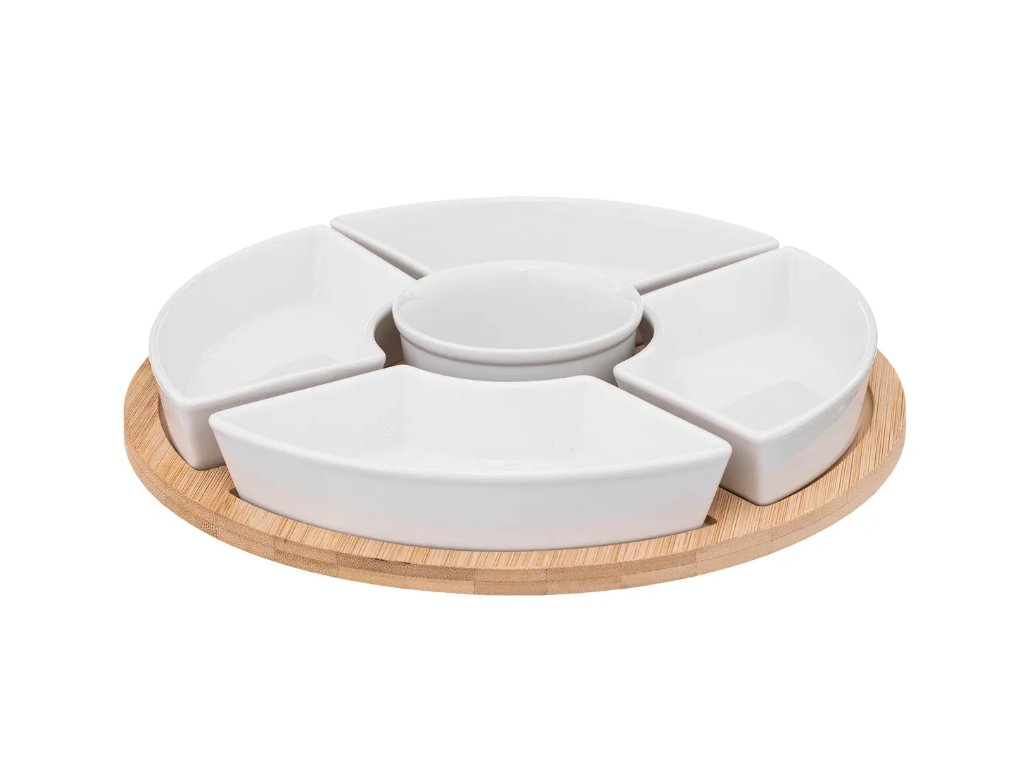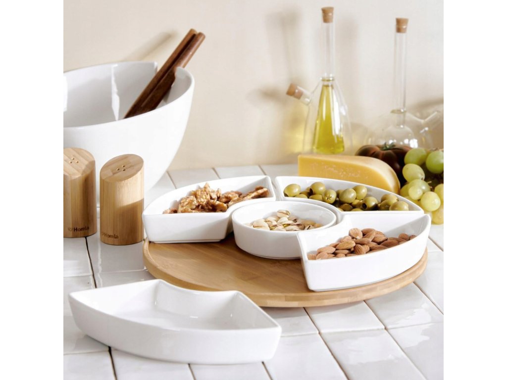 - Materiál: Vysokokvalitní porcelán, který zaručuje odolnost a elegantní vzhled, bambusový podnos, který elegantně doplní váš stůl a usnadní servírování.