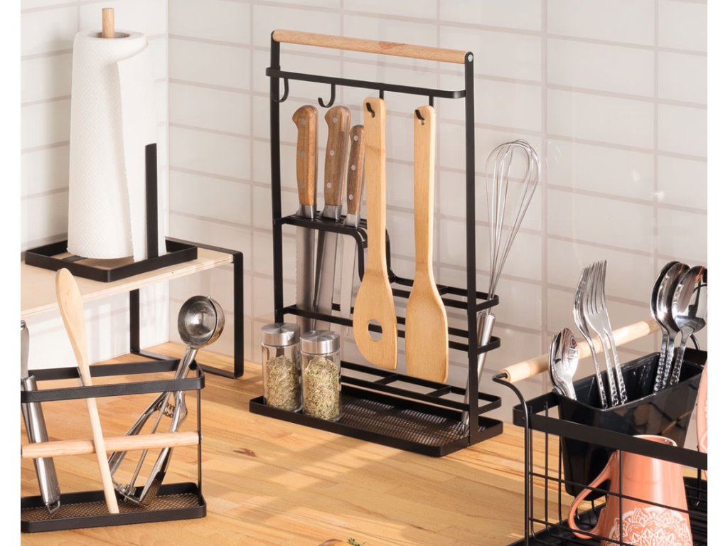 Stylový a praktický kuchyňský organizér z dřeva a oceli v černé barvě o délce 43 cm vám pomůže s organizací a uskladněním vašich kuchyňských potřeb.