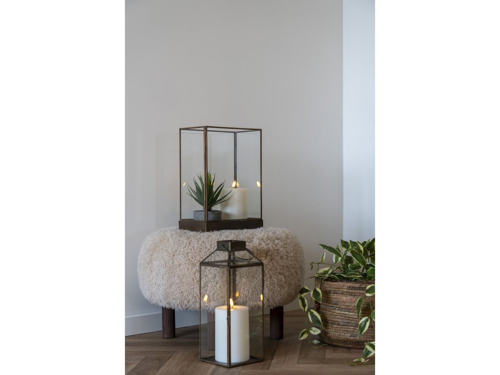 Skleněná lucerna Manali s kovovým rámem v hnědé barvě představuje elegantní a přírodní dekorativní prvek. Její kombinace kovu a skla vytváří teplé a útulné osvětlení, ideální pro venkovní večery nebo jako dekorace v interiéru, například na terase nebo v obývacím pokoji.