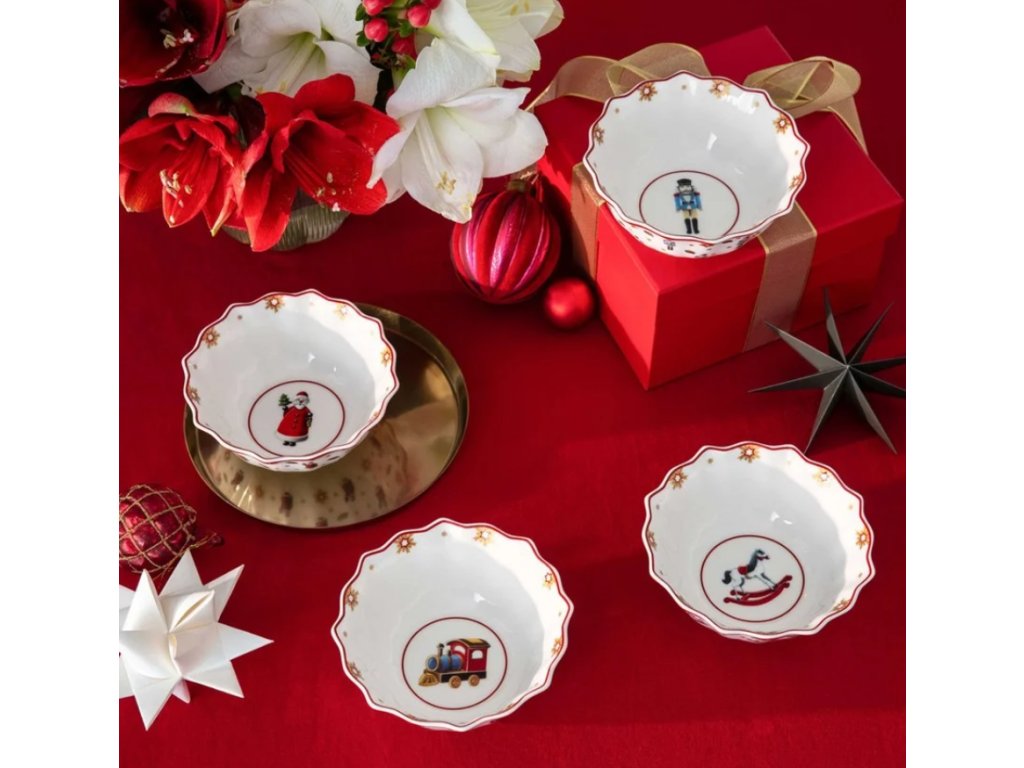 Výroční sada čtyř misek s nostalgickými motivy přináší kouzlo tradičních Vánoc. Každá miska je zdobena jiným svátečním obrázkem, které evokují vzpomínky na dětství a rodinné tradice.