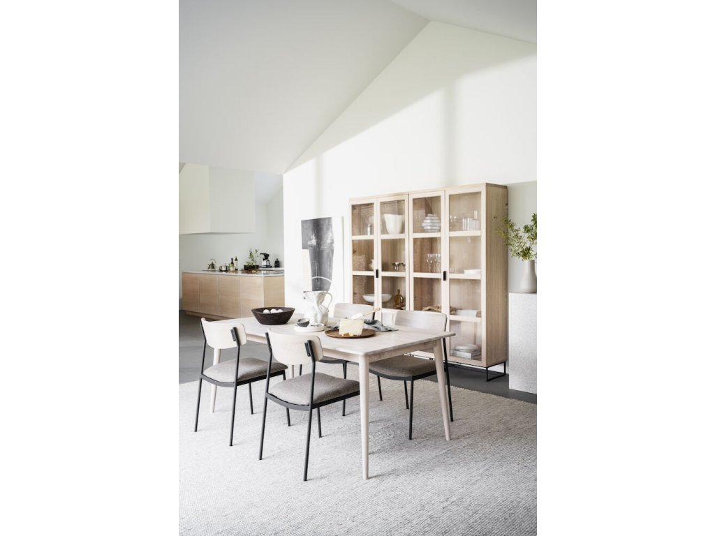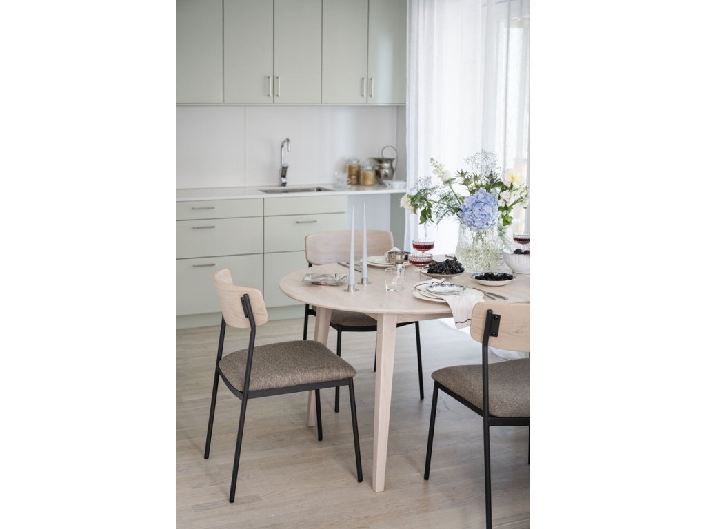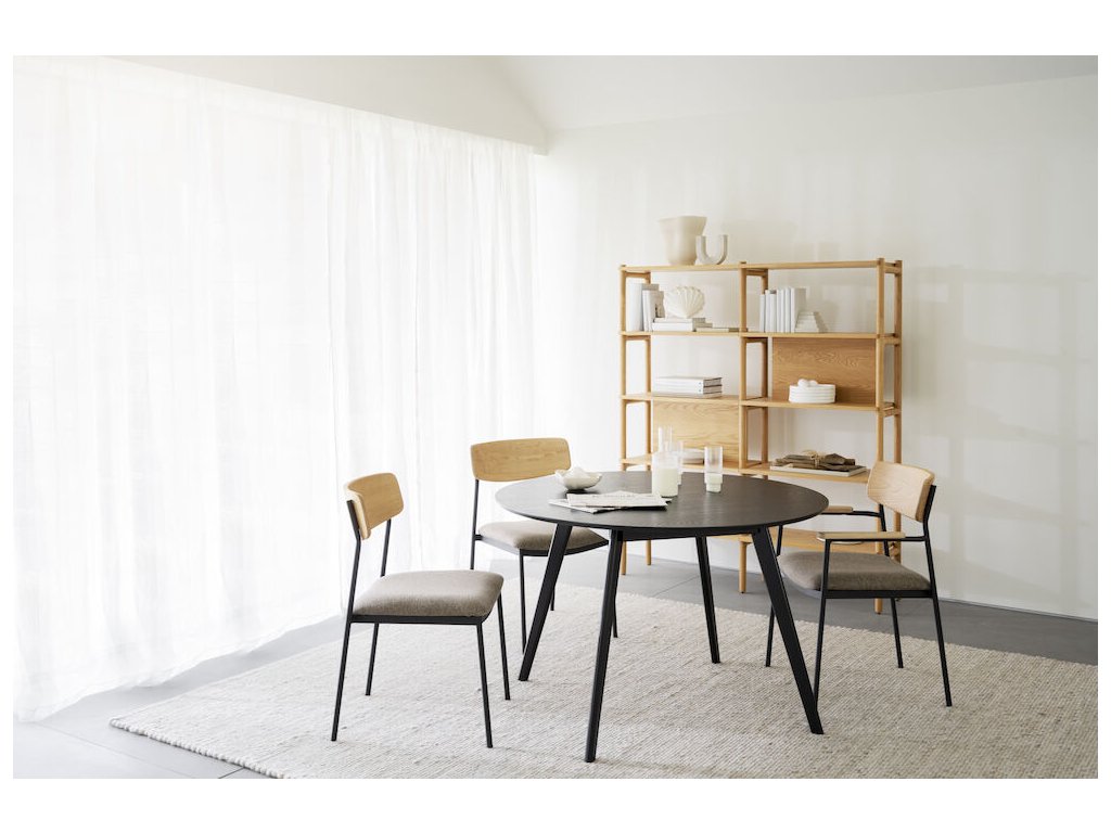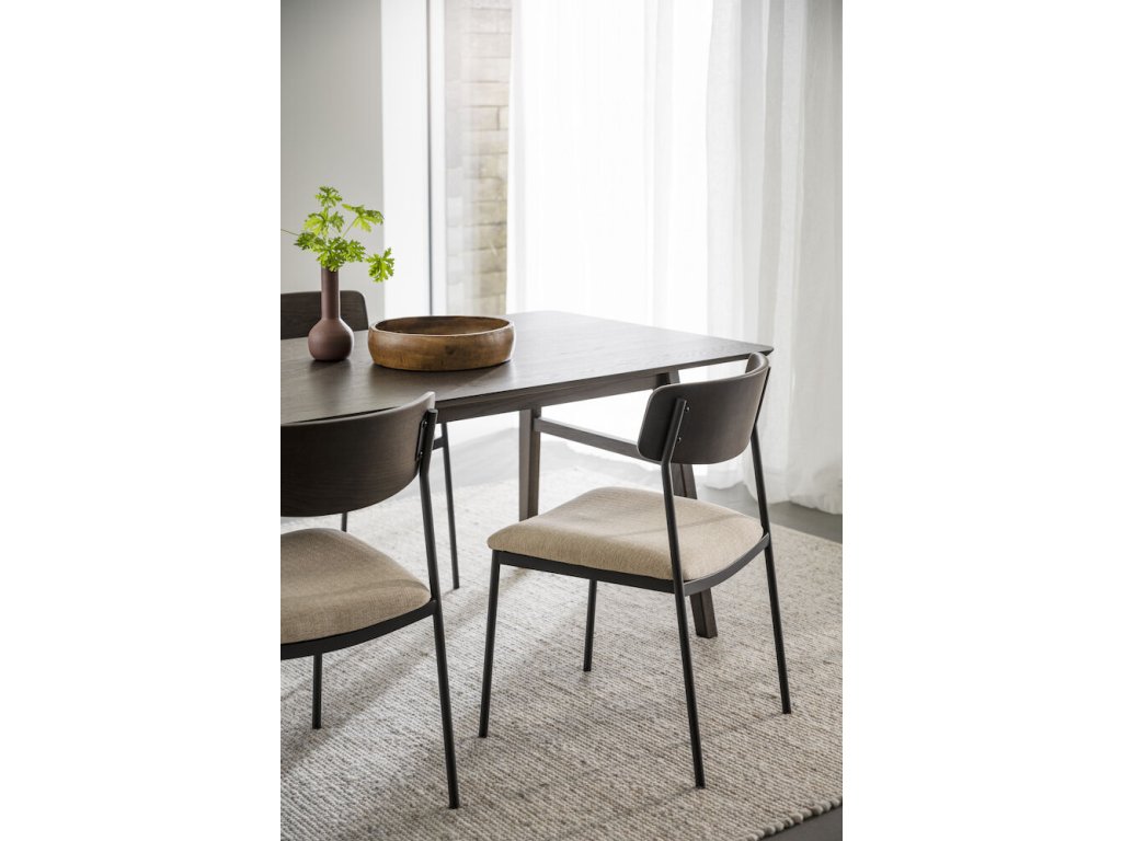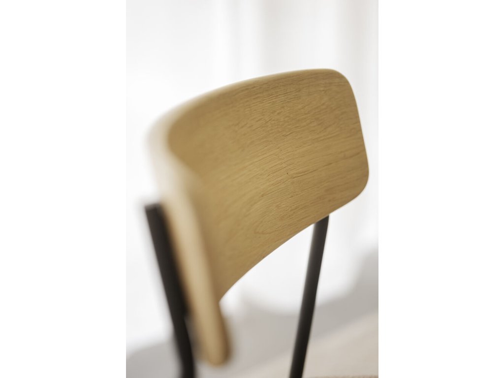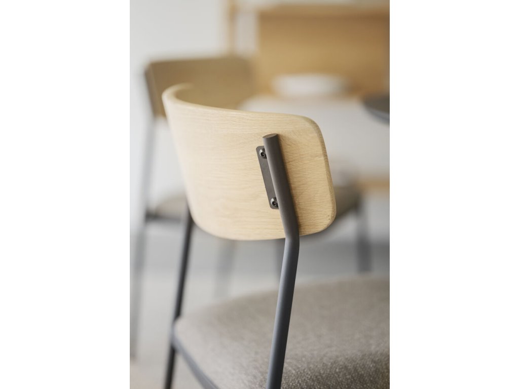 Židle Maymont je moderní, stohovatelná židle s čistými liniemi, která je ideální pro použití kolem jídelního stolu nebo při větších akcích. Je vyrobena z odolného ocelového rámu s práškovým lakováním s pískovou strukturou, doplněného opěradlem z masivního dubu – v variantách bíleného, hnědého nebo přírodního – a sedákem z překližky čalouněným polypropylenovou tkaninou. Nohy jsou z černého práškově lakovaného kovu, v kombinaci s tvarovaným opěradlem, které lze objednat v hnědém, bíleném nebo tmavě béžovém dubu, případně v přírodní podobě. Židle se dá naskládat na sebe nebo umístit libovolný počet kolem stolu, což je vhodné pro domácnosti i komerční prostory. Splňuje certifikaci FSC®, zajišťující původ dřeva z odpovědného lesnictví.