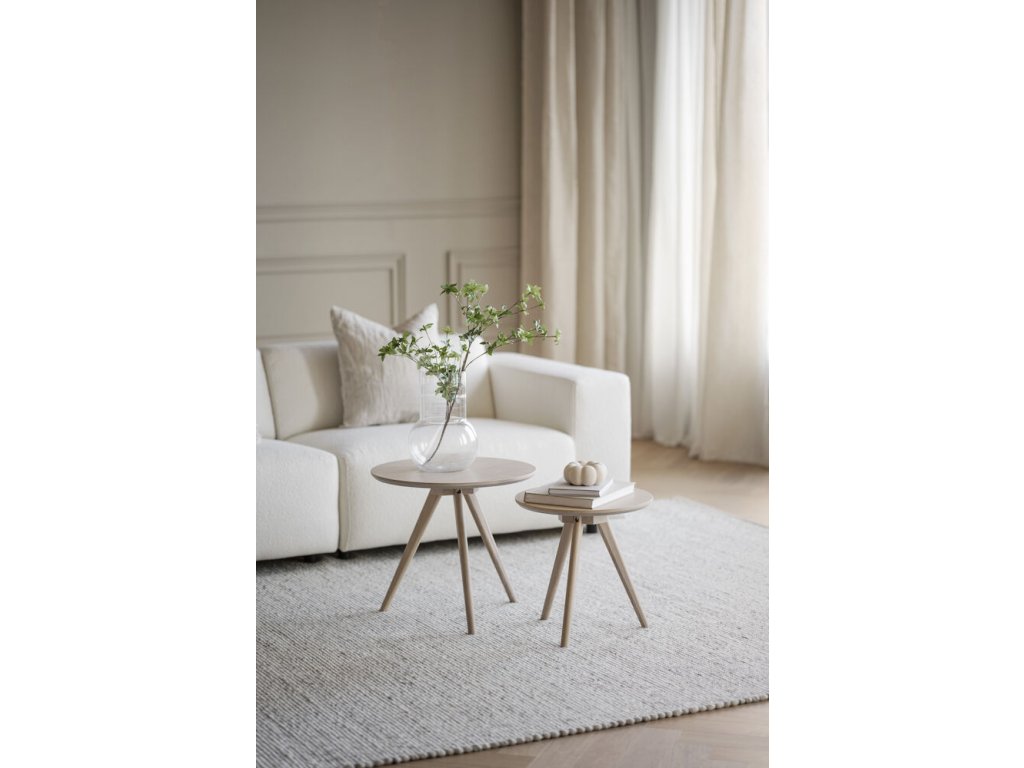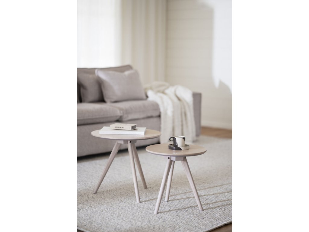 Sada stolků Yumi s mírně odhalenými nohami v nadčasovém skandinávském designu, který vydrží rok co rok. Desky stolu z bíle natřené lakované dubové dýhy a nohy z masivního dubu. Velký stůl; Ø 50 cm, výška 45 cm, malý stůl; Ø 40 cm, výška 40 cm. Nebojte se kombinovat s dalším nábytkem ze série Yumi.