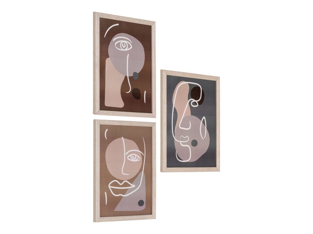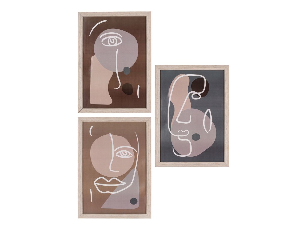 Sada tří moderních obrazů v minimalistickém stylu. Každý z obrazů zobrazuje abstraktní obličejové tvary a linie v jemných odstínech hnědé, béžové a šedé. Rámy těchto obrazů jsou z lehkého dřeva, což dodává celkovému designu příjemný a elegantní vzhled. Tato sada je ideální pro ty, kteří hledají moderní doplněk do svého interiéru.