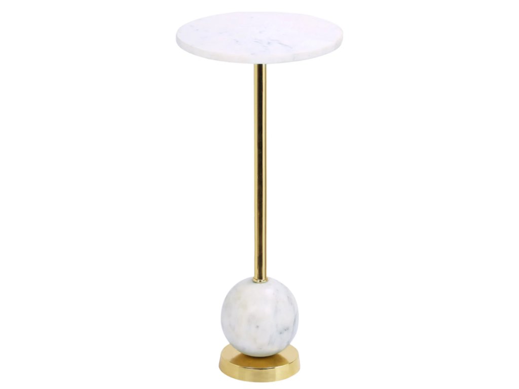 Stylový odkládací stolek, který kombinuje luxusní vzhled s funkčností. Vrchní deska je z elegantního mramoru, která přináší do prostoru punc noblesy. Tenká zlatá tyč spojuje vršek s kulatým mramorovým základem, který je vsazen na elegantní zlatou základnu.