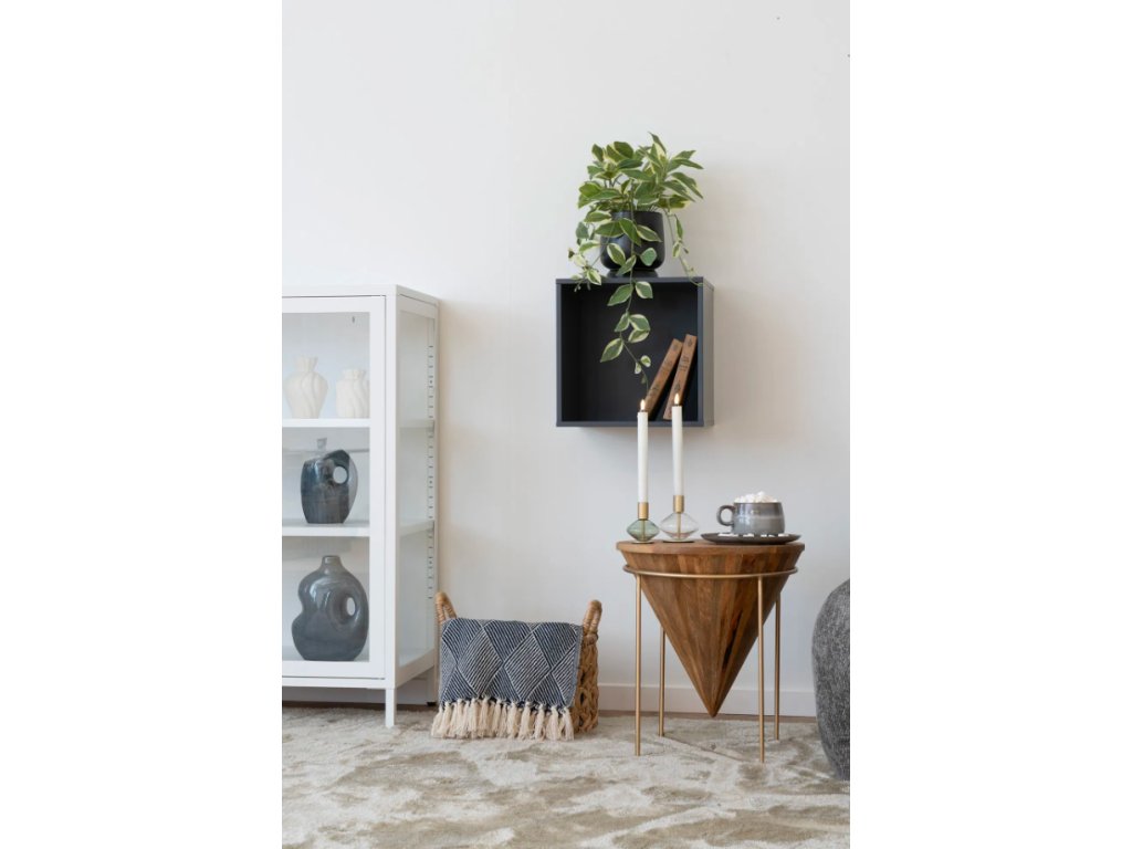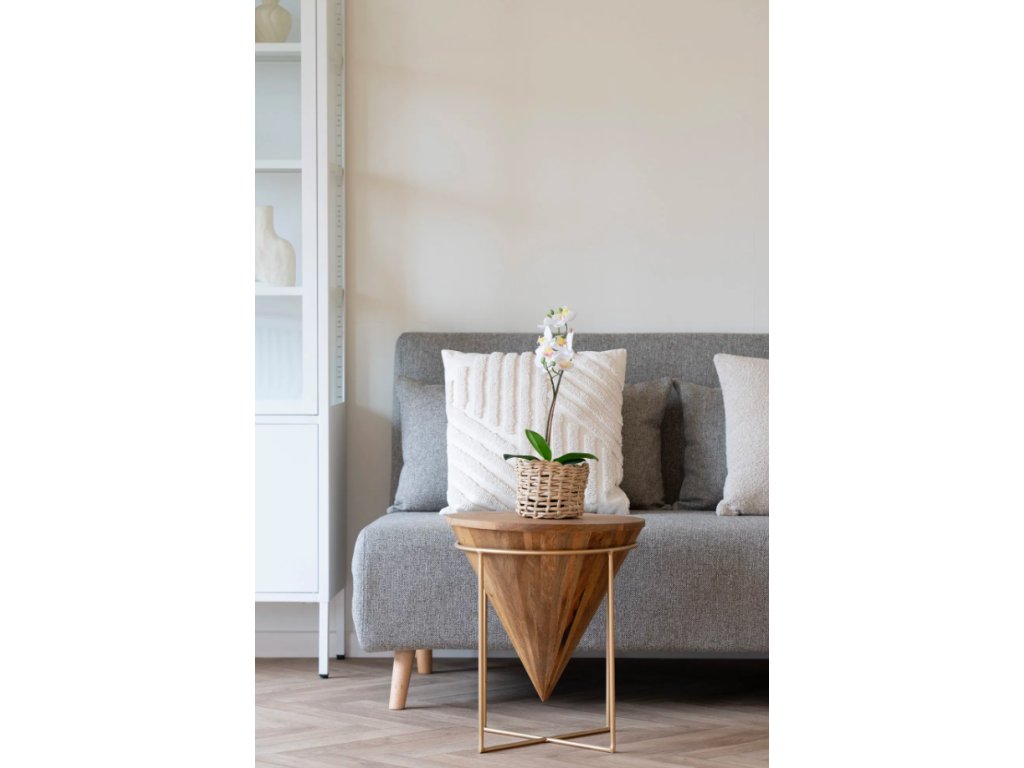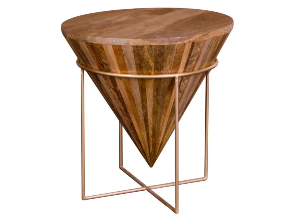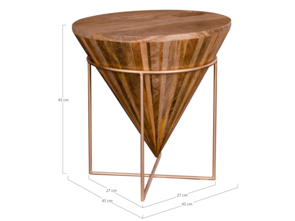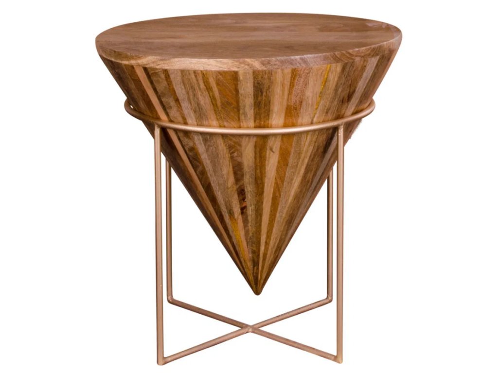 Elegantní a výrazný odkládací stolek vyrobený z mangového dřeva, které dodává výrobku přirozenou strukturu a teplé odstíny. Tvarově připomíná špičatou pyramidu nebo kužel, což dodává interiéru moderní a originální vzhled.