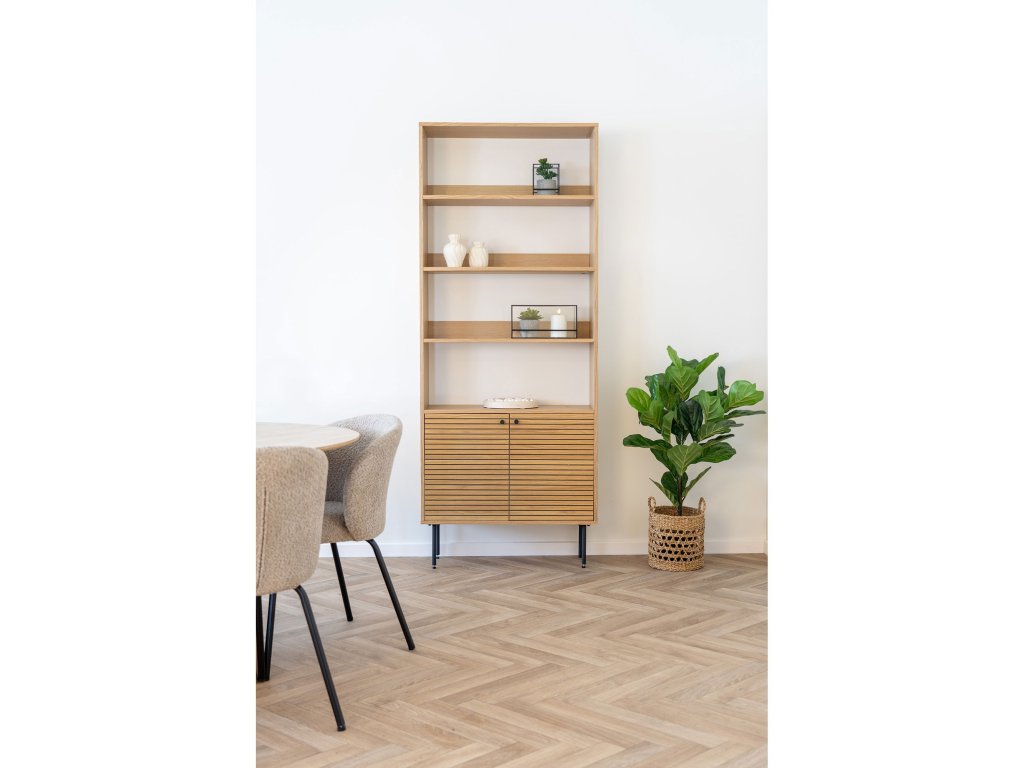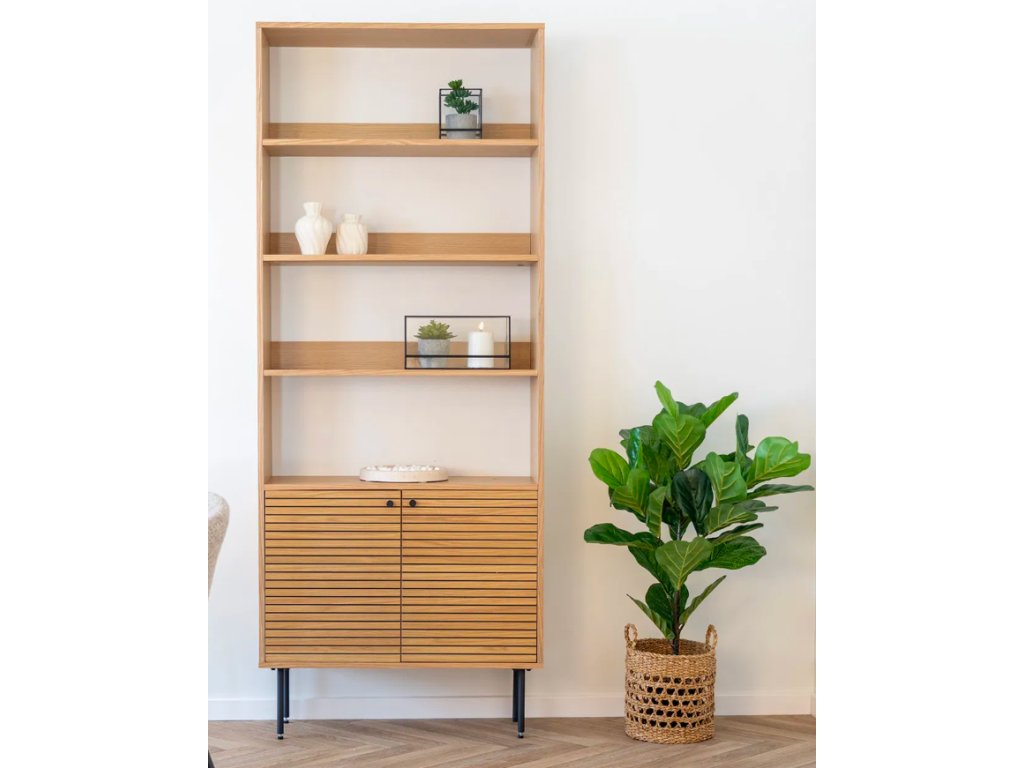 Stylová knihovna v dekoru dubu o rozměrech 80×200 cm Kyoto nabízí prostorné a praktické úložné řešení s přirozeným vzhledem. Vysoce kvalitní materiál a moderní design dodají vašemu interiéru teplo a eleganci. Ideální do obývacího pokoje, pracovny nebo studovny, kde poslouží jako funkční i dekorativní prvek pro vaše knihy a dekorace.