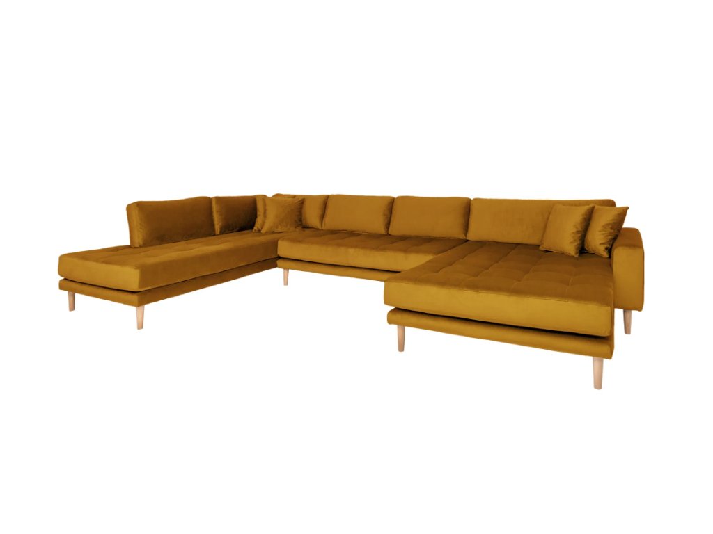 Pohovka Lido ve tvaru U v hořčicově žlutém sametovém čalounění je výrazným a moderním prvkem, který dodá interiéru osobitý charakter. Díky délce 370 cm nabízí velkorysý prostor pro komfortní sezení i odpočinek celé rodiny. Pravé rohové provedení umožňuje praktické přizpůsobení konkrétnímu uspořádání místnosti.