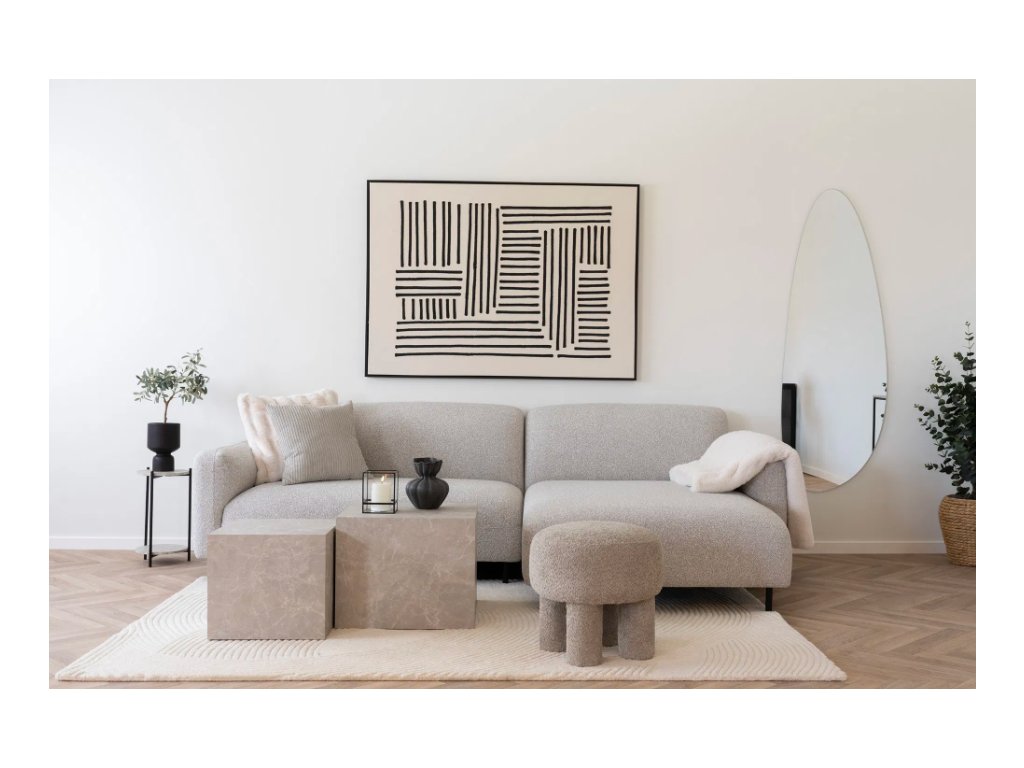 - Luxusní materiály: Potah z šedého boucle je nejen elegantní, ale také praktický. Tento materiál dodává pohovce moderní a nadčasový vzhled, který se hodí do každého interiéru. Měkká polyuretanová pěna zajišťuje maximální pohodlí při sezení.