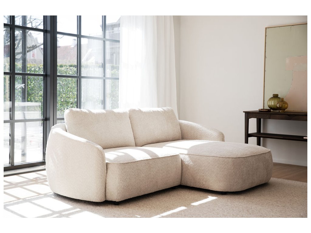 Objevte nadčasovou krásu a výjimečný komfort v podobě pohovky Norris. Její světle béžový odstín v kombinaci s jemně lesklou žinylkou dodává interiéru pocit lehkosti a sofistikovanosti. Lenoška v levém rohu zve k ničím nerušenému odpočinku, zatímco prostorné sedáky a opěrky přinášejí dokonalé pohodlí.