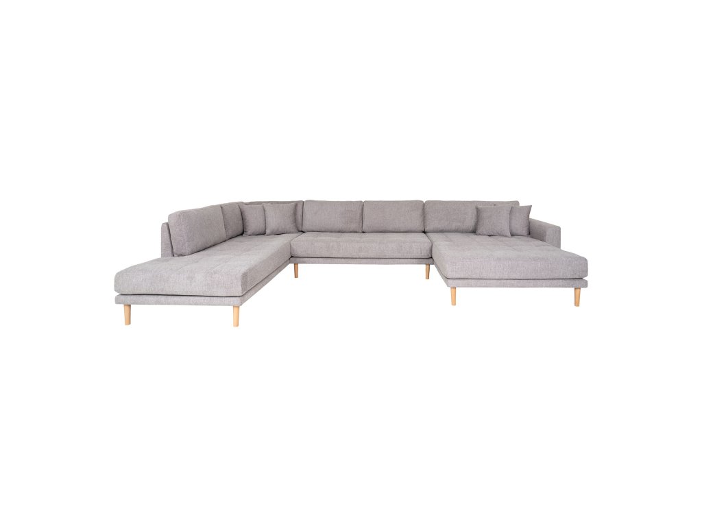 světlé šedá pohovka ve tvaru U s otevřeným koncem, pravý roh, 4 polštáře, nohy z přírodního dřeva, Lido