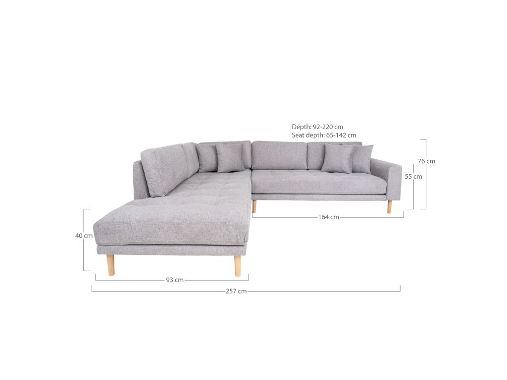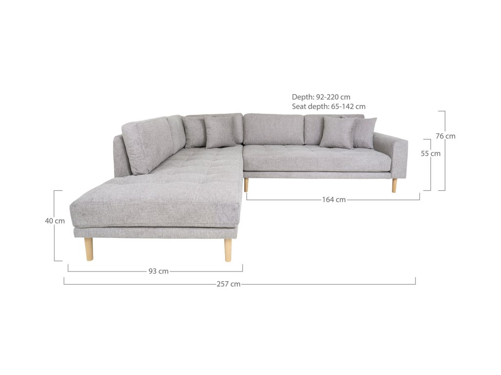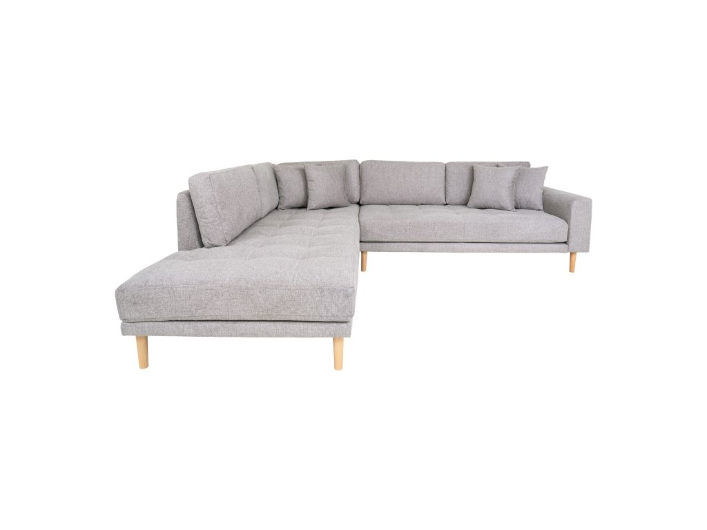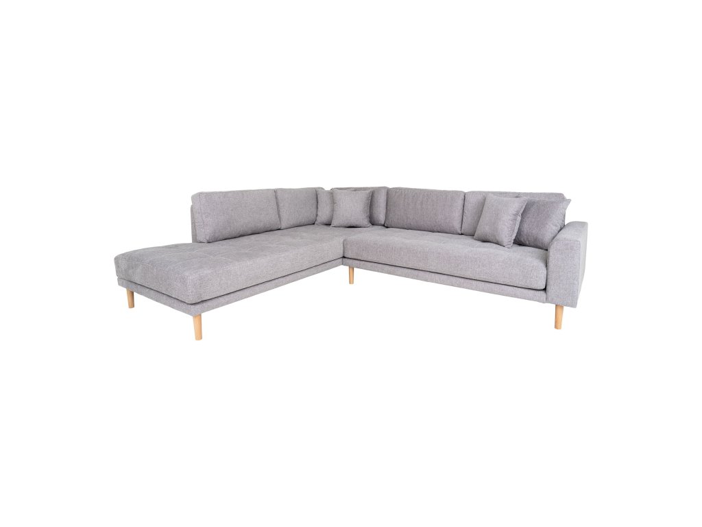 světlé šedá rohová pohovka levý roh s otevřeným koncem, 4 polštáře, nohy z přírodního dřeva, Lido