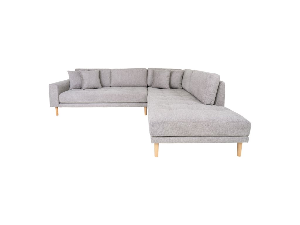 světlé šedá rohová pohovka levý roh s otevřeným koncem, 4 polštáře, nohy z přírodního dřeva, Lido