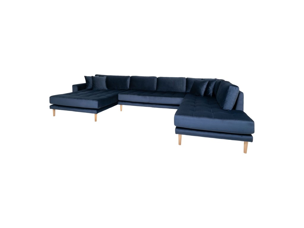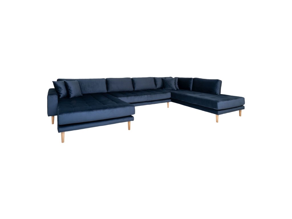 Tmavě modrá pohovka ve tvaru U s levou stranou a otevřeným koncem, 4 polštáře, nohy z přírodního dřeva, Lido