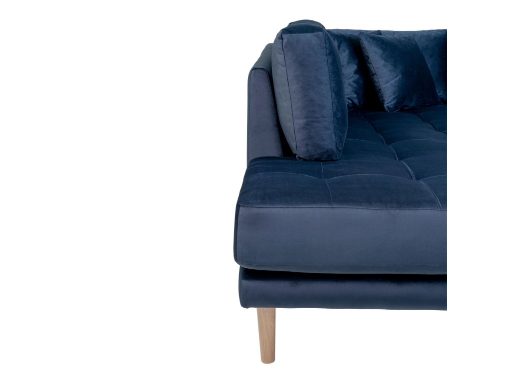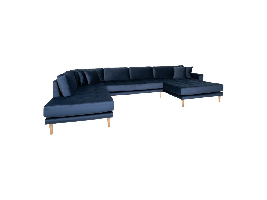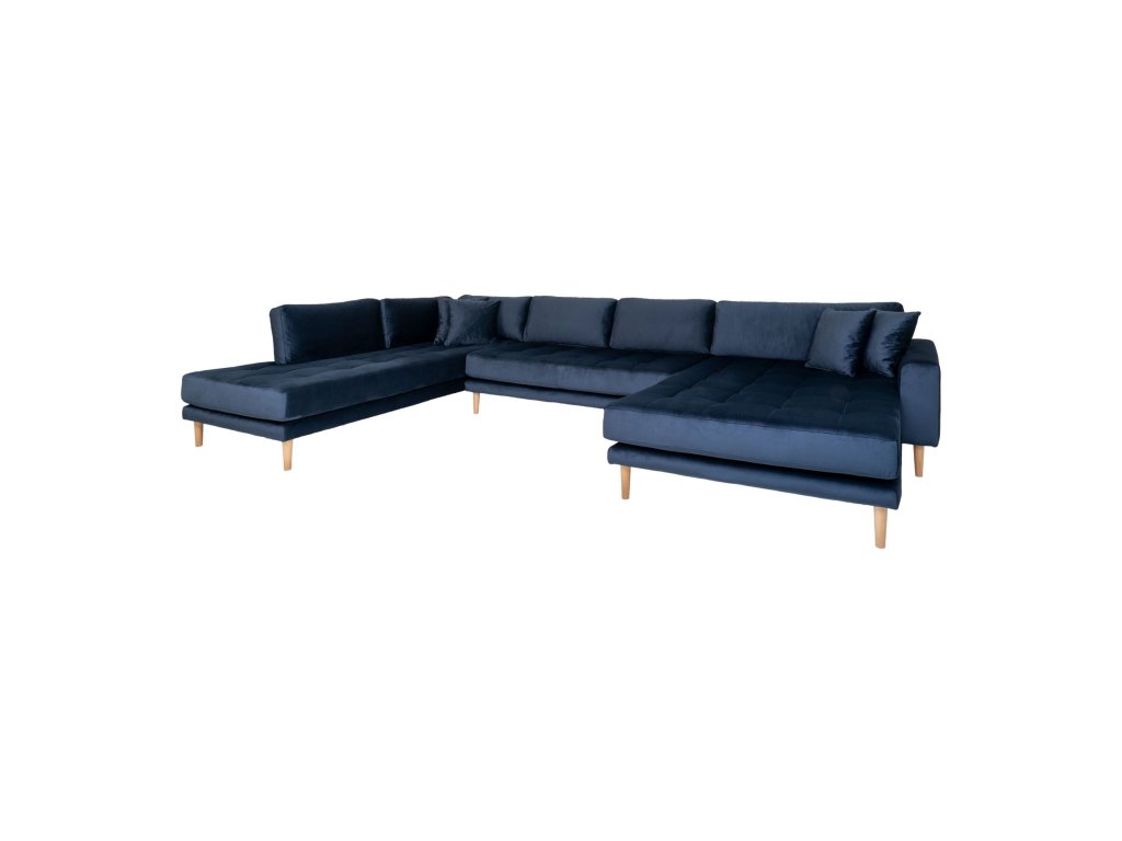Tmavě modrá pohovka ve tvaru U s otevřeným koncem, pravá strana, 4 polštáře, nohy z přírodního dřeva, Lido