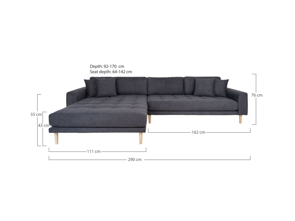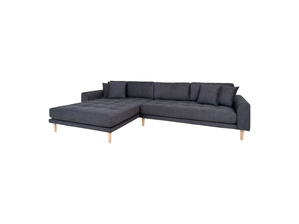 Tmavě šedá pohovka levý roh se 4 polštáři, nohy z přírodního dřeva, Lido