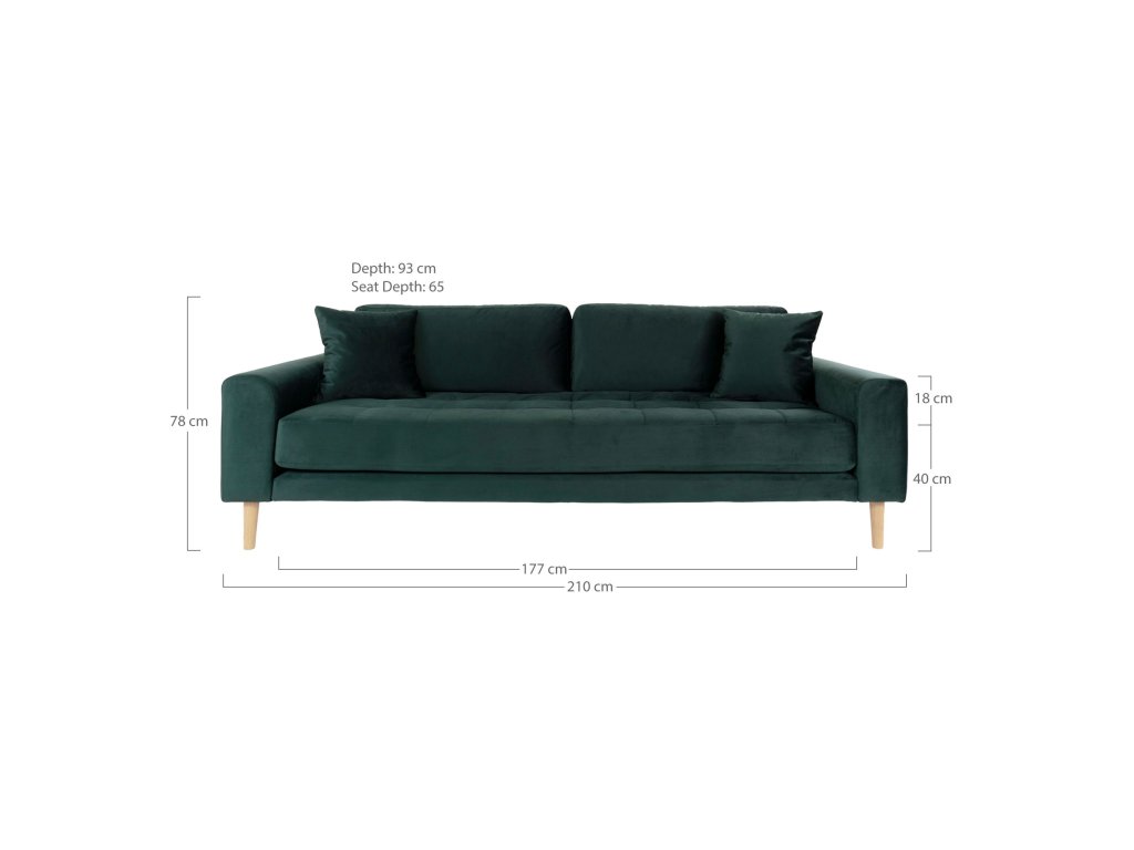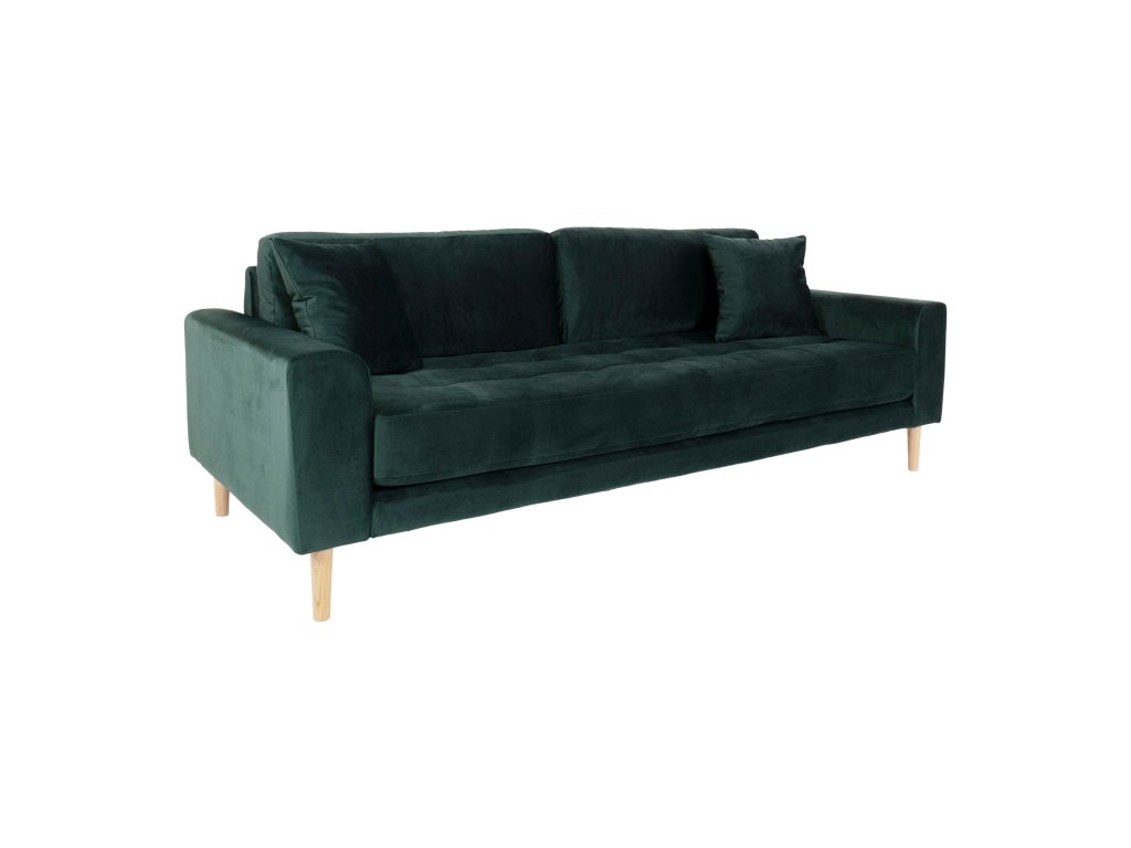 Tmavě zelená třímístná pohovka se 2 polštáři, nohy z přírodního dřeva, Lido