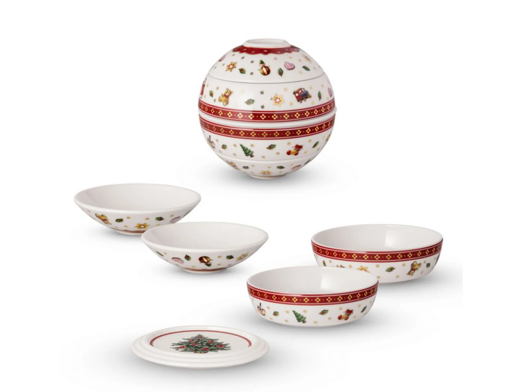 Sada La petite Boule Toy’s Delight byla navržena pro sváteční období Vánoc s důrazem na harmonii mezi estetikou a funkčností. Je skvělá pro podávání cukroví, drobného občerstvení, ale zároveň funguje jako elegantní dekorace. Porcelán zdobí tradiční vánoční barevnost – bílá, červená a zlatá – doplněná ikonickými motivy kolekce.