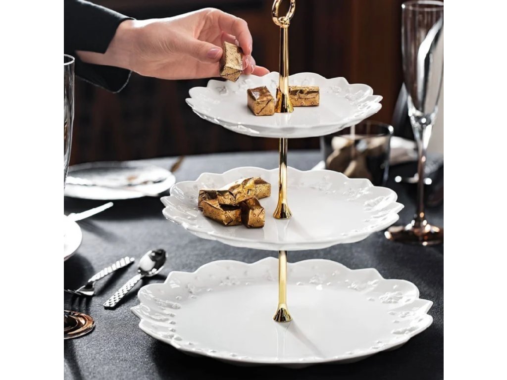 Nadčasově krásný dvoupatrový servírovací stojan z kolekce Toy’s Delight Royal Classic vyniká čistou elegancí. Bílý porcelán doplňují jemné reliéfní vzory, které podtrhují luxusní vzhled. Ideální pro servírování dezertů, cukroví i vánočních specialit.